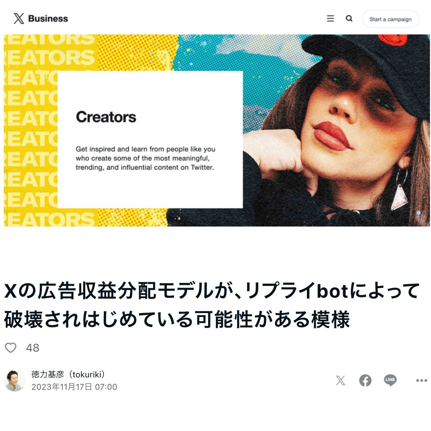 Xビジネスのページに行くとクリエイター向けのページがあって、そこの収益を上げるためのメニューに、実はこの広告収益分配プログラムはまだ言及なかったですよね。