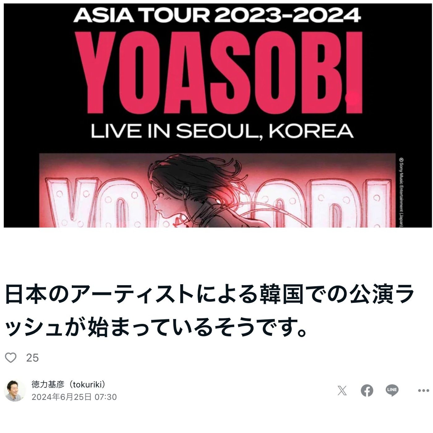 僕と同じ世代の方からすると、韓国って20年前の話ですけどね、日本のエンタメを遮断してた時代があって、日本のアーティストが韓国でライブをやるっていうのは、難しいっていうイメージが昔はあったんですけど、それがここに来て一気に公演ラッシュが始まってますっていうのが、このNHKの記事の内容でした。