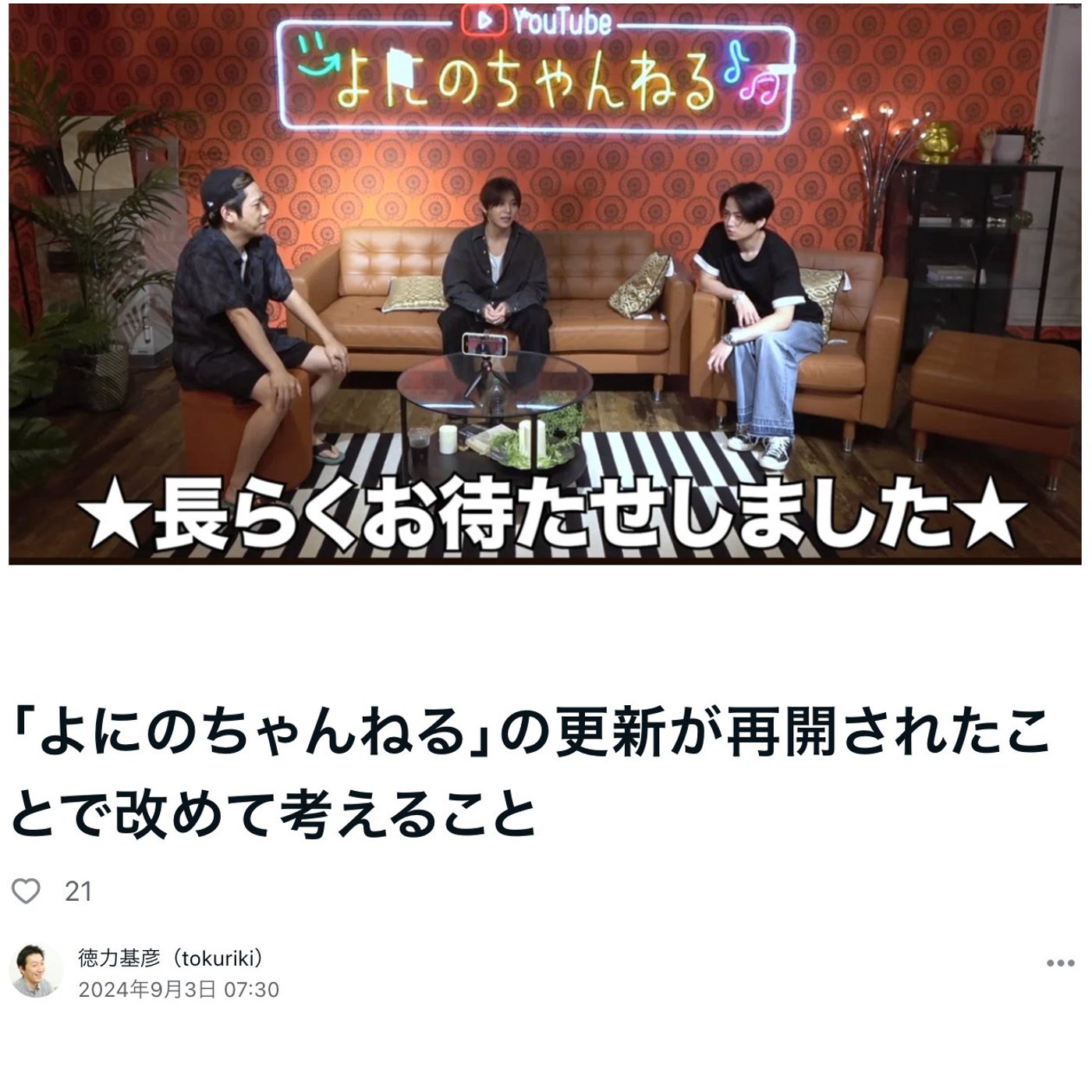 はい、こんにちは、徳力です。今日はですね、更新を停止していたよにのちゃんねるが無事に再開されたということで、