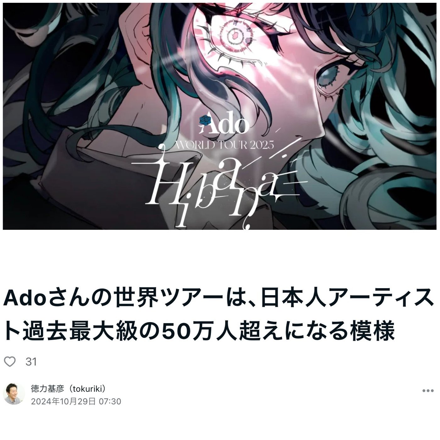 はい、こんにちは、徳力です。今日はですね、Adoさんのワールドツアー、今年やったばっかりじゃなかったっけ?って話なんですけど、