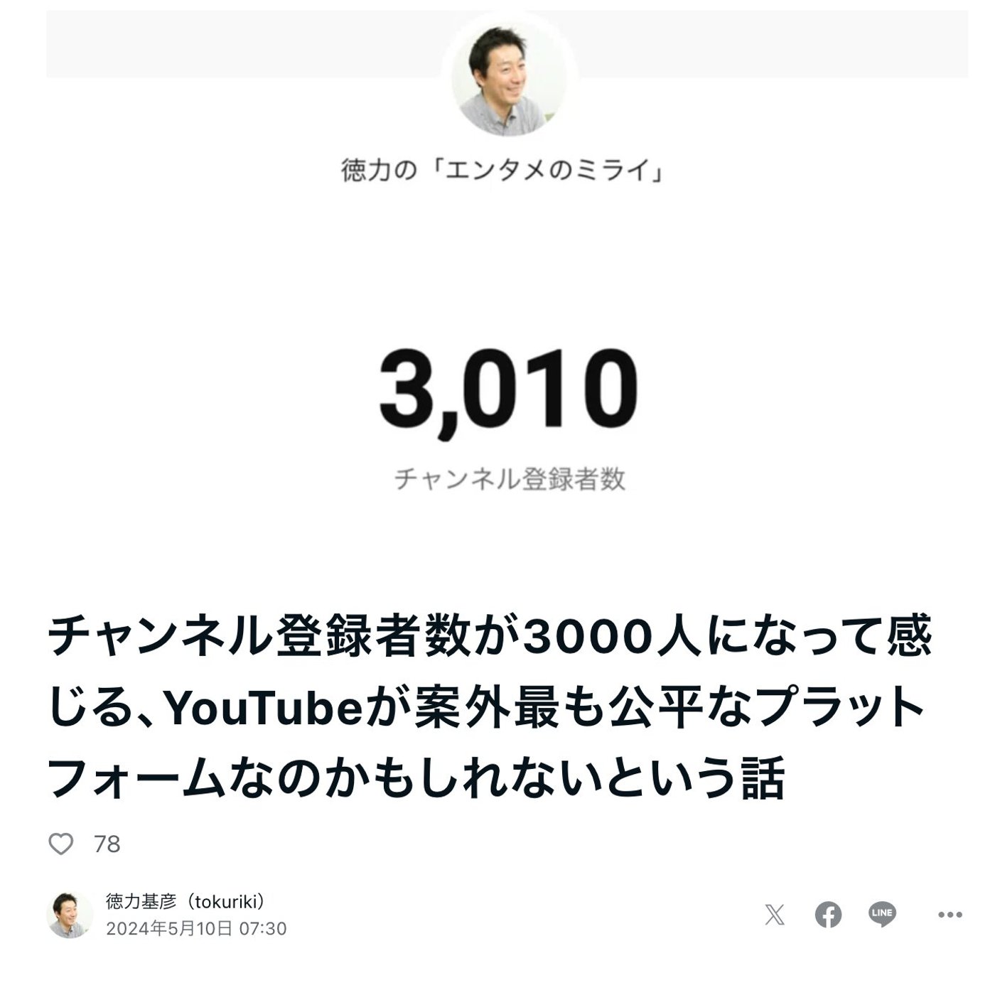 はい、こんにちは、徳力です。今日はですね、地味に続けているYouTubeのチャンネルなんですけれども、おかげさまで登録者数が3,000人に届きましたということで、皆さま本当にありがとうございます。