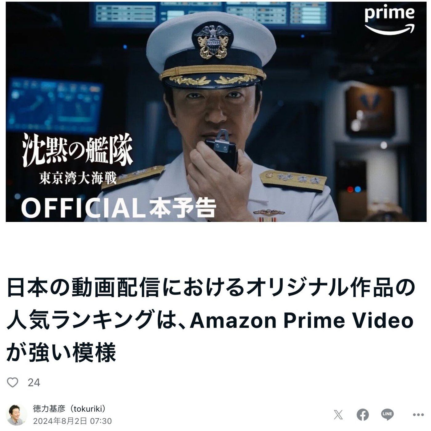 記事のタイトルは、日本の動画配信におけるオリジナル作品の人気ランキングは、Amazon プライムビデオが強い模様っていうタイトルにしてみたんですけど、これ意外ですよねって言うと、ちょっと沈黙の艦隊ファンの方からちょっとお怒りの言葉をいただいてしまうかもしれないですけど、
