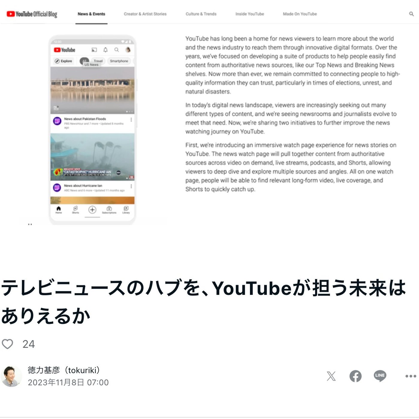 元ネタは、インプレスウォッチで、YouTubeニュースを深掘りできる新機能、テレビも対応予定ということで、