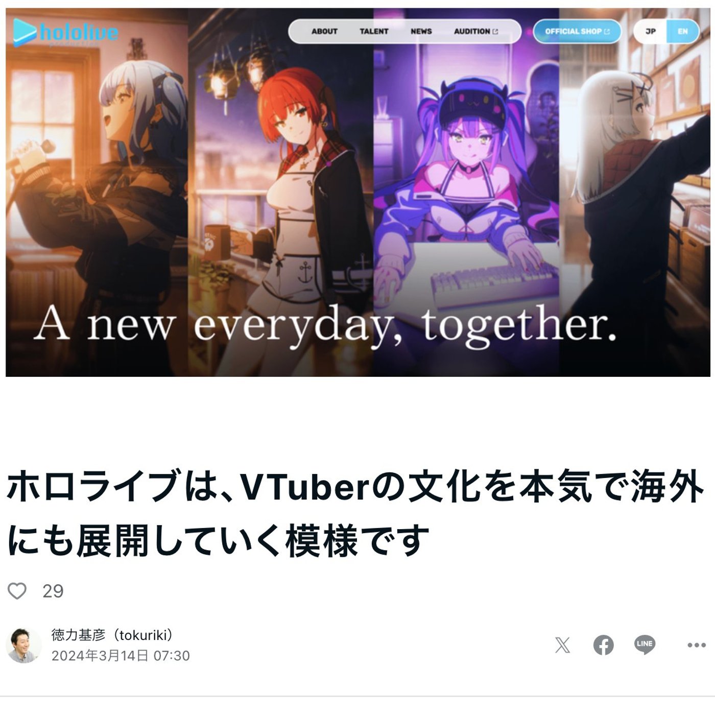 ホロライブがVTuberの海外展開を本格展開するということで、元ネタはVTuber、ビジネスインサイダーですね。