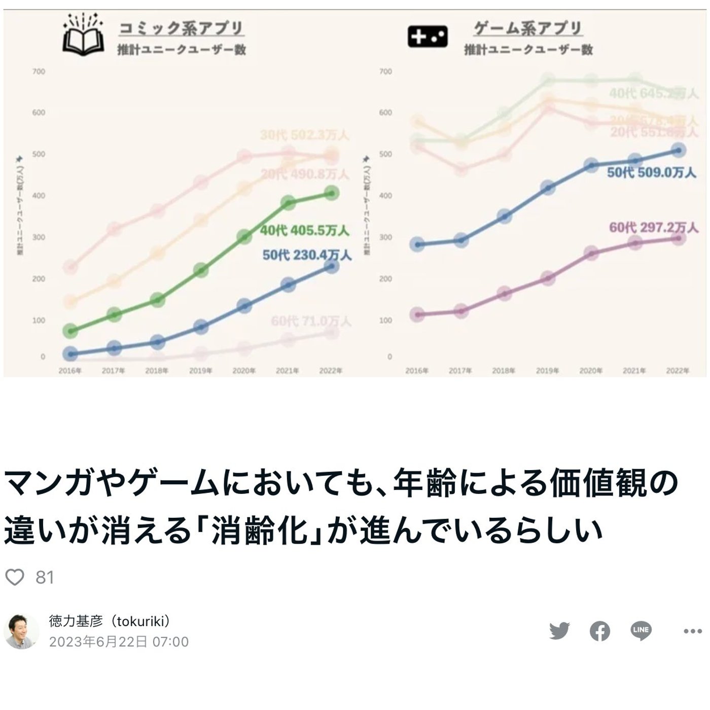 コミック系アプリのユーザー数の推移を見れば全体的に上がってるよねって話で、20代30代が先に急増してて、40代50代が後からっていうふうに、
