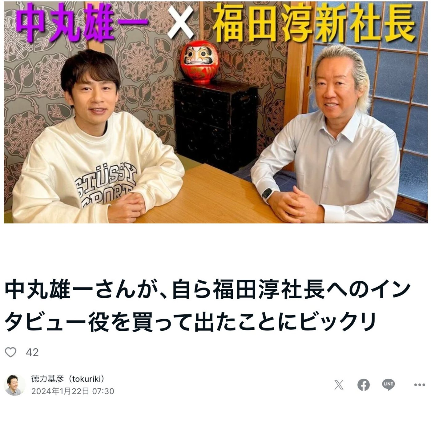 はい、こんにちは、徳里です。今日はですね、中丸さんがYouTubeチャンネルを始めたんですけれども、最初の一人目のインタビュー対象は、なんとスタートエンターテインメントの新社長である福田さんということで、ちょっとね、びっくりしたんで、早速ちょっと現時点での感想をメモってみました。