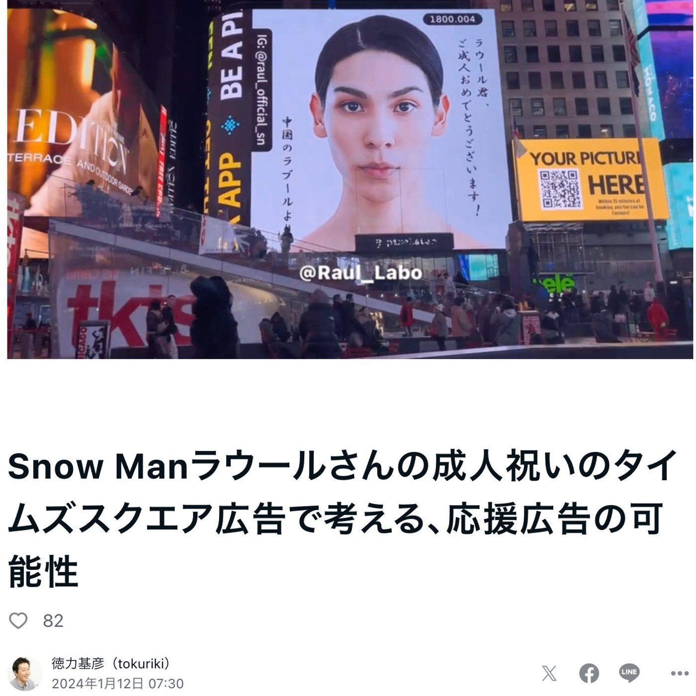 はい、こんにちは、徳力です。 今日はですね、スペースをやってる時にコメントでラウールさんの応援広告がタイムズスクリエンスに出てますよっていうのをご紹介いただいたので、ちょっと軽くまとめてみました。