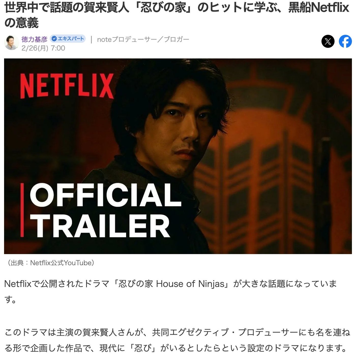 Yahoo!には、世界中で話題の賀来賢人「忍びの家」のヒットに学ぶ、黒船Netflixの意義っていう記事を書いてみたんですけど、これね、「忍びの家」ご覧になってますかね。見てる人と見てない人で、多分印象が全然違うと思うんですけど、