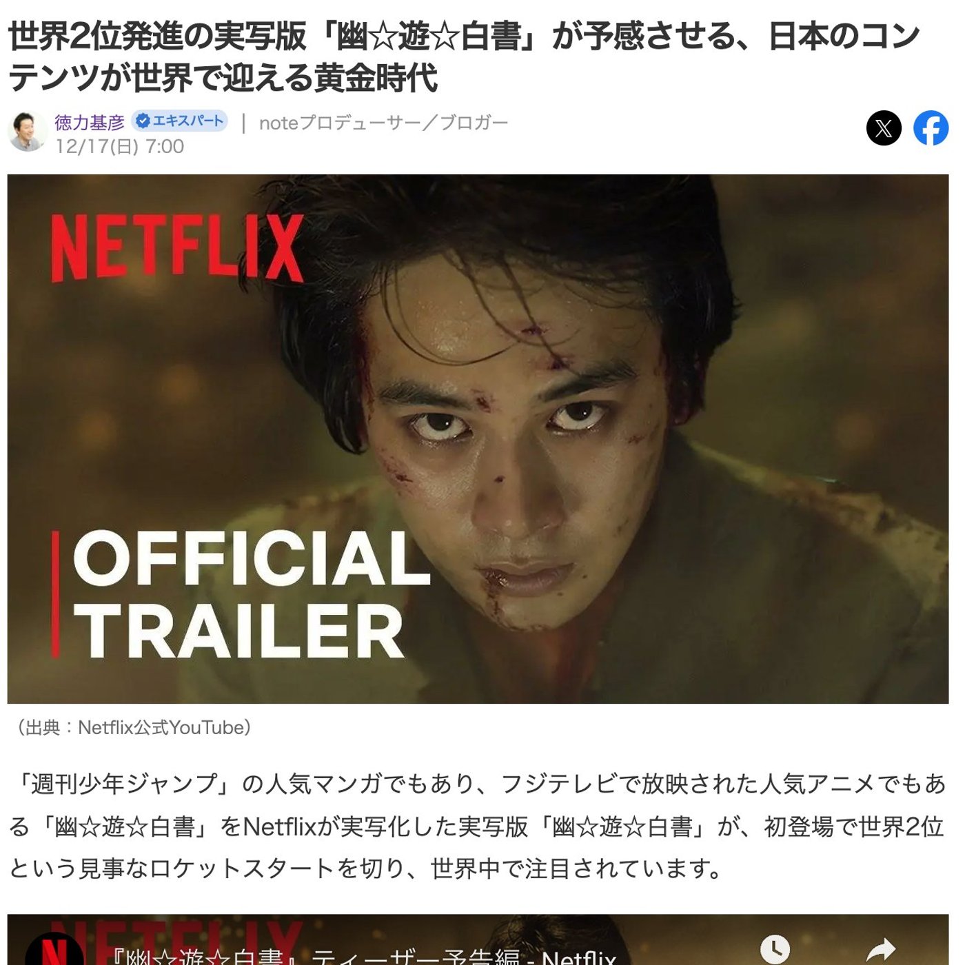 はい、こんにちは、徳力です。今日はですね、Netflixでいよいよ、実写版幽☆遊☆白書が公開されまして、素晴らしいスタートを切ってますんで、ご紹介したいと思います。