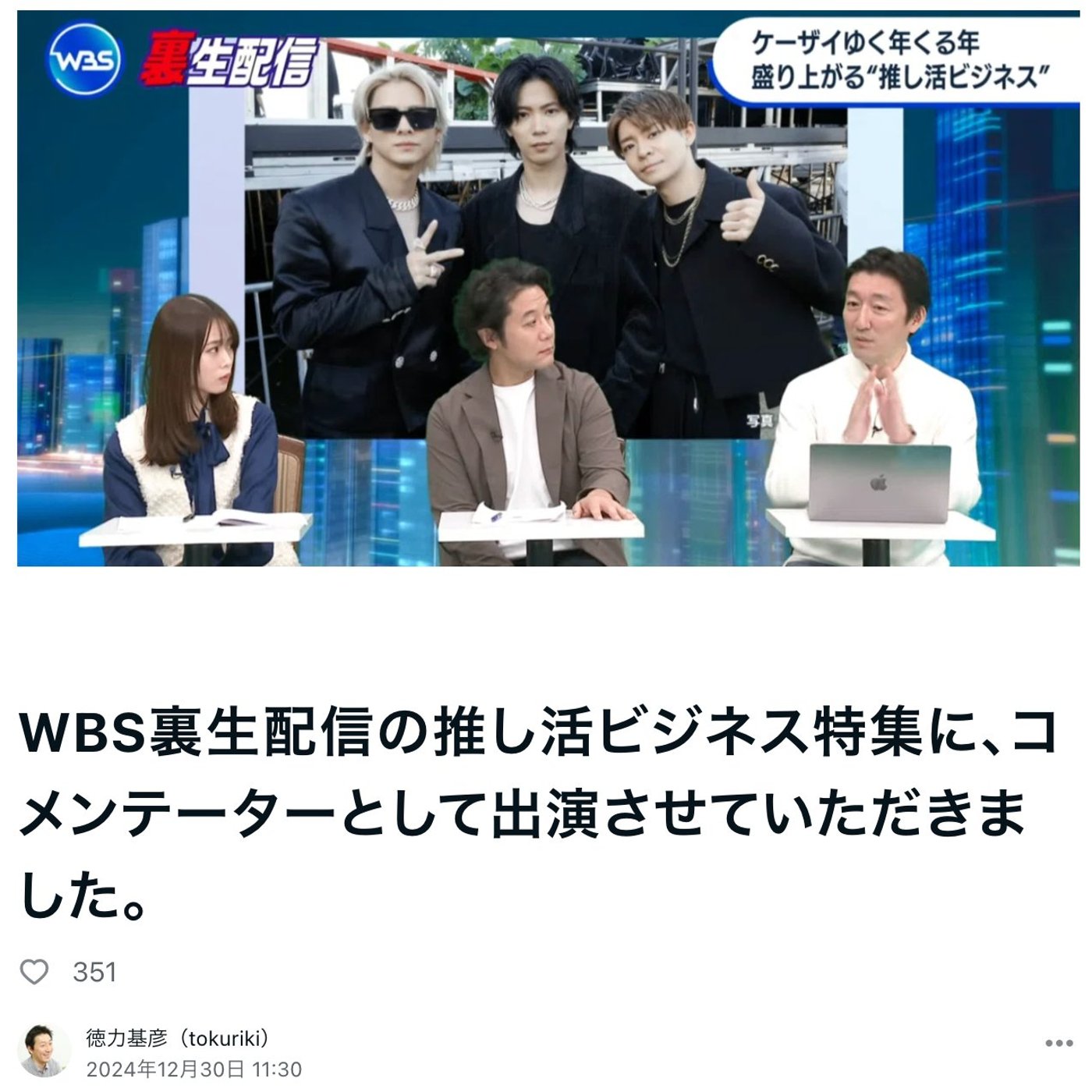 はい、こんにちは、徳力です。今日はですね、年末にテレ東さんのWBS裏生配信という番組に出演させていただきましたので、その時のコメントの補足をさせていただこうと思います。