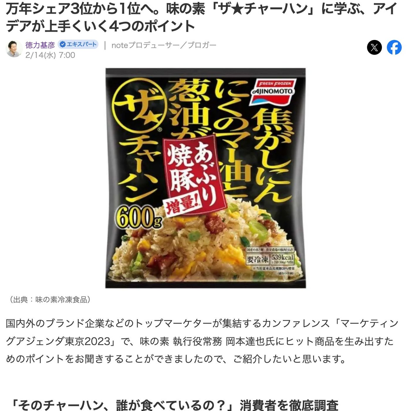 はい、こんにちは、徳力です。今日はですね、去年お話を聞いた味の素冷凍食品のザ★チャーハンのヒットの裏側の話が非常に面白かったので、ご紹介したいと思います。