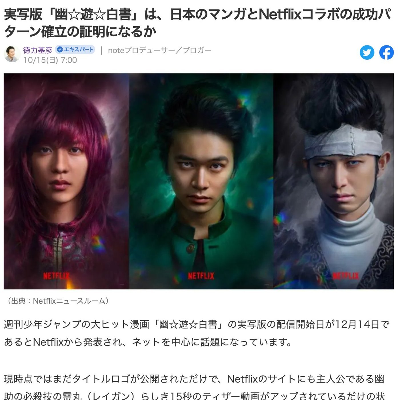 はい、こんにちは、徳力です。今日はですね、「幽☆遊☆白書」の実写版がいよいよ12月公開というのがネトリックスから