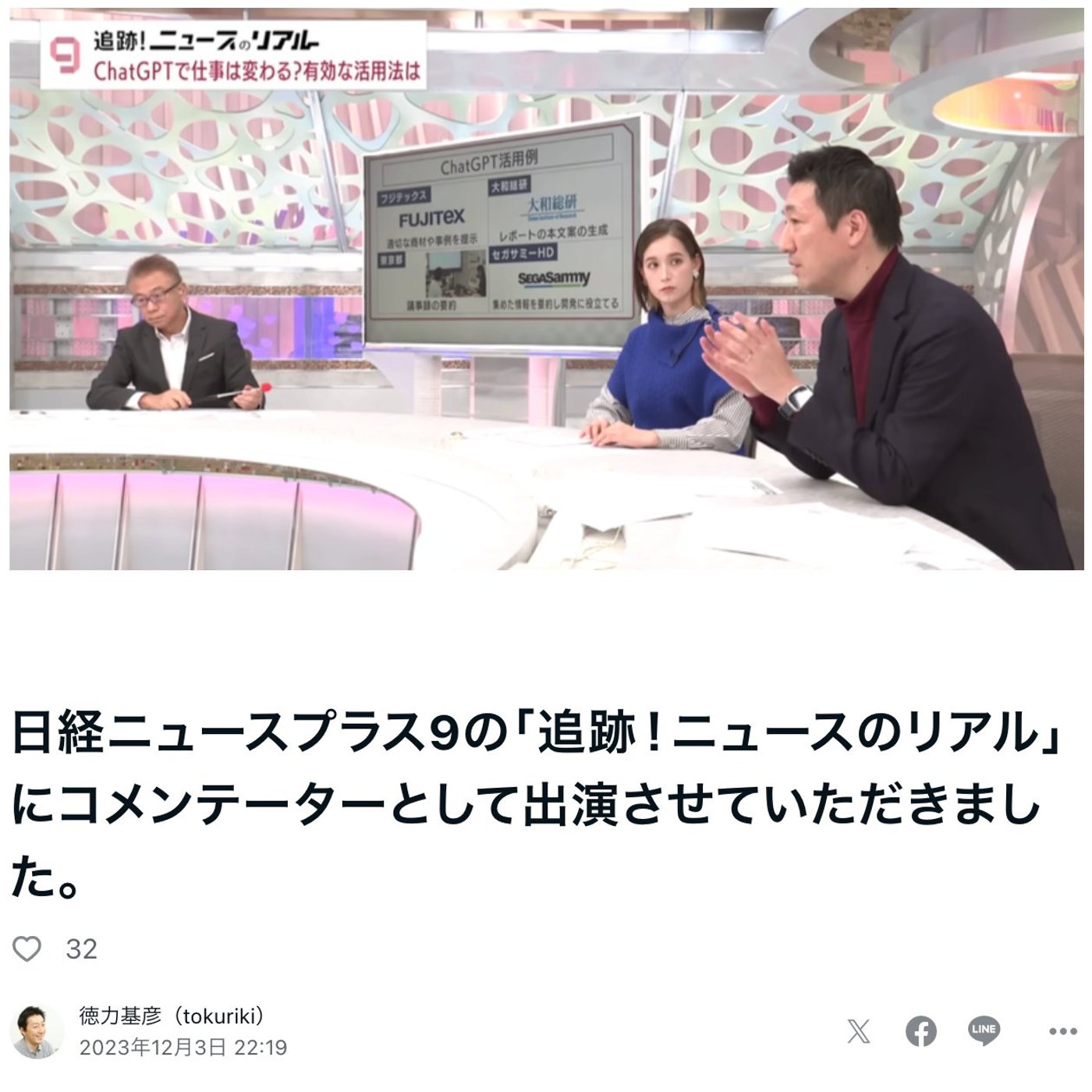 今日は、BSテレ東さんの日経ニュースプラスナインに先日、チャットGPT特集で出演させていただきましたので、そのときの裏話をご紹介したいと思います。