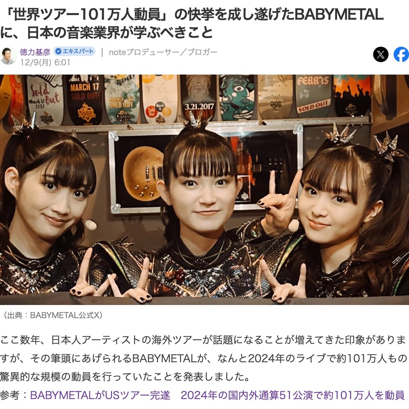 はい、こんにちは、徳力です。今日はですね、BABYMETALの海外でのライブの動員数が100万人超えてたという発表がありまして、