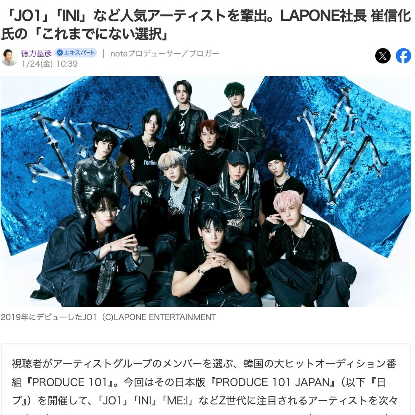 前半の記事が、JO1、INIなど人気アーティストを輩出。ラポネ社長のこれまでにない選択っていうタイトルなんです。