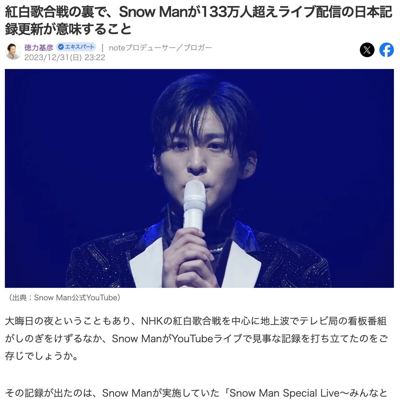今日はですね、大晦日の紅白歌合戦の裏でやっていたSnow ManのYouTubeライブが日本記録更新したということで、記事をYahoo!に寄稿しましたので、ご紹介したいと思います。