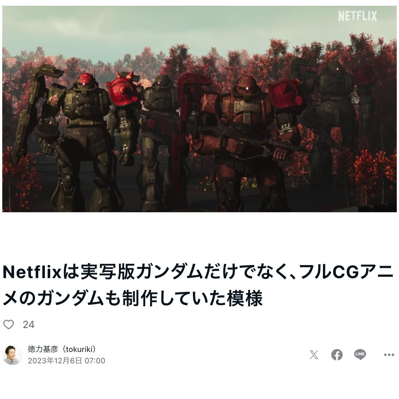 はい、こんにちは徳力です。今日はですね、ガンダムのフル3D CGアニメがNetflixで独占配信ということで、元記事はテクノエッジさんの記事なんですけど、監督はバイオハザードインフィニットダークネスを手掛けたエラスマスブラスター星、知らないですけど、3D CGアニメ系を作られている方々ですよね。