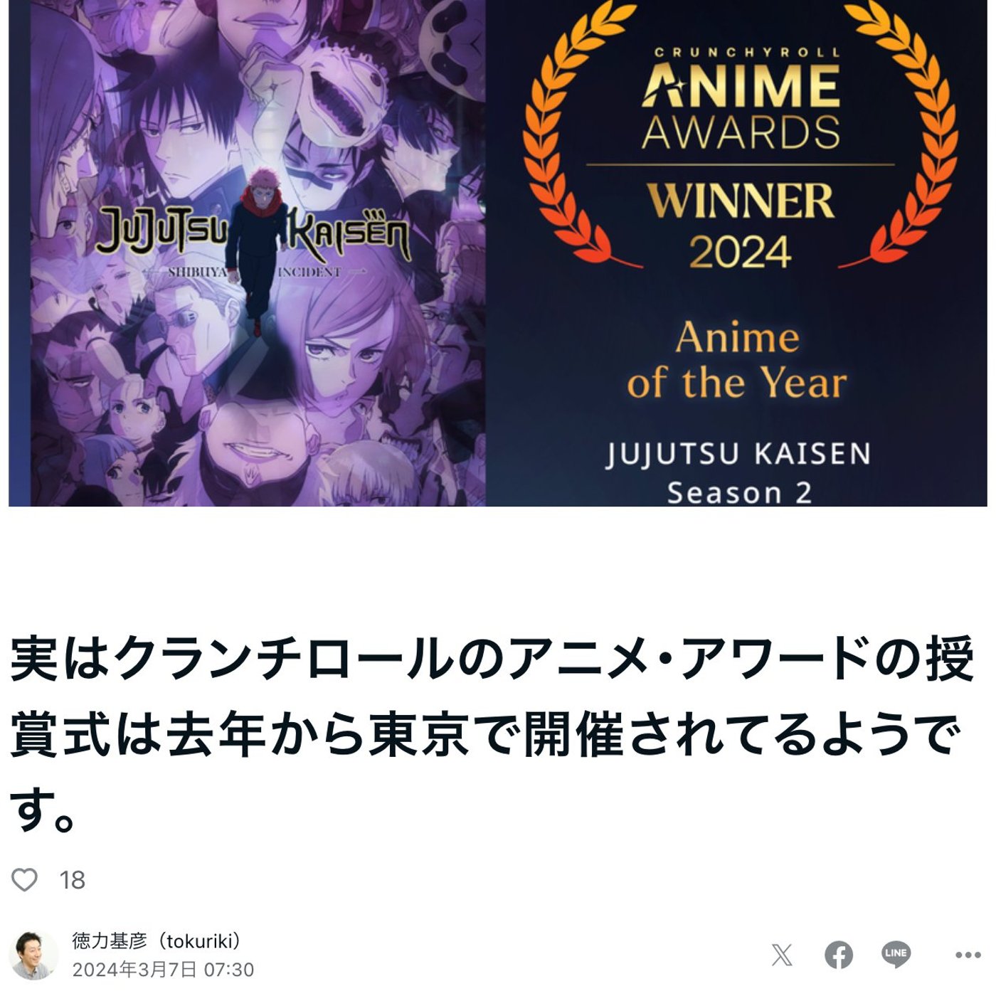 はい、こんにちは、徳利です。今日はですね、クランチロールアニメアワードっていうのが3月、これ2日に開催されてたんですけど、そのレポートを渡辺ゆみ子さんが詳細に挙げてらしてですね、ちょっとそうだ、忘れてたと思って、ちょっと慌てて取り上げてみました。