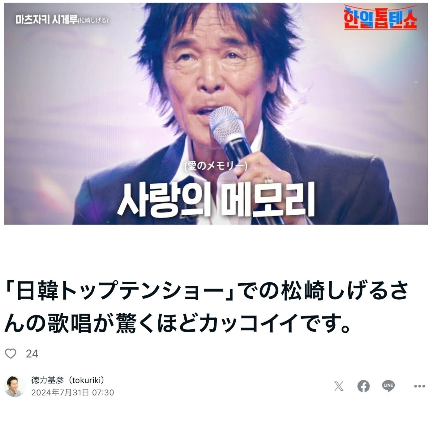 どっちかっていうと芸人さんとかにちょっといじられてる側のキャラだと思うんですけど、このね、日韓トップテンショーでの松崎さんの扱いがすごいいいんですよね、すごい良いっていう言い方が変なんですけど、かっこいいんですよ。