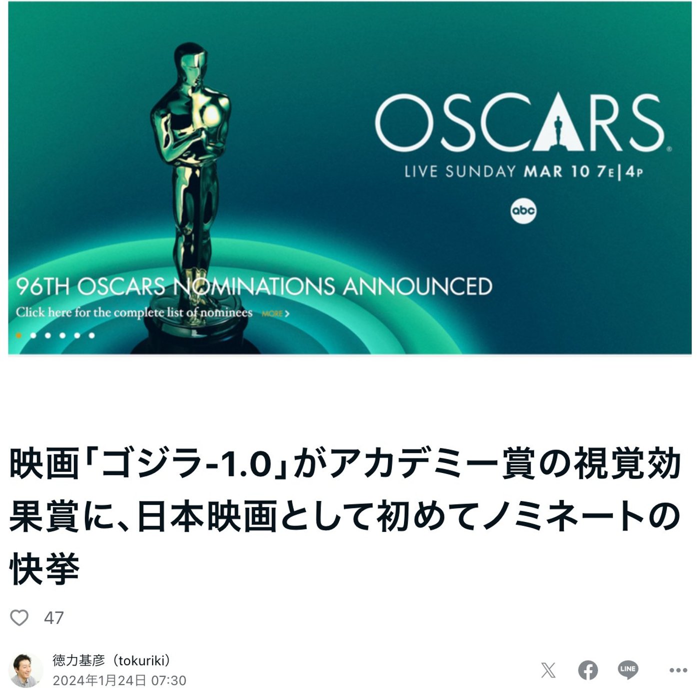 で、なんといっても今回、視覚効果賞にゴジラ-1が日本映画で初めてノミネートということで。