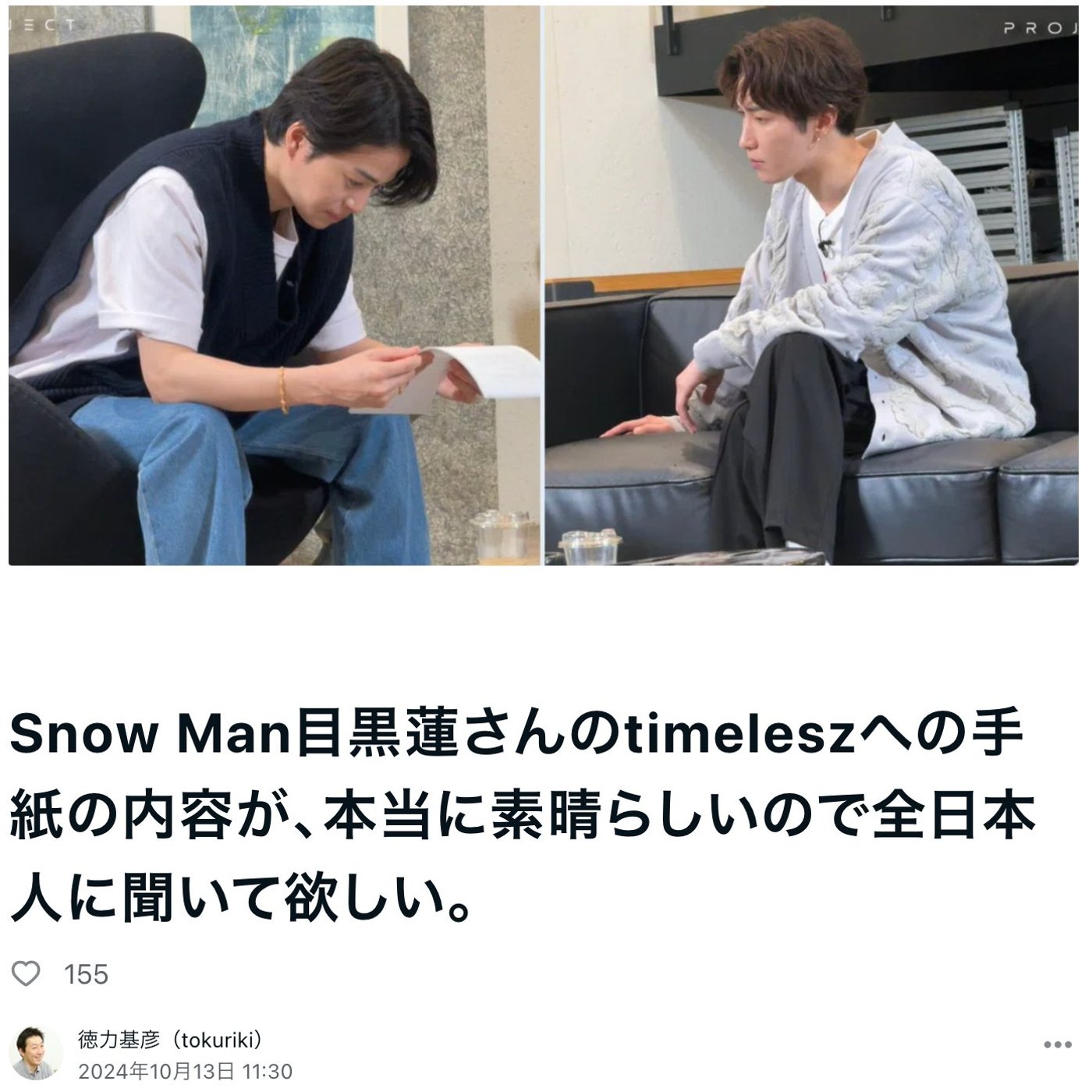 記事は、Snow Man目黒蓮さんのtimeleszへの手紙の内容、ほんと素晴らしいので全日本人に聞いて欲しいので、ちょっとずりきじ的なタイトルにしてみましたけど、