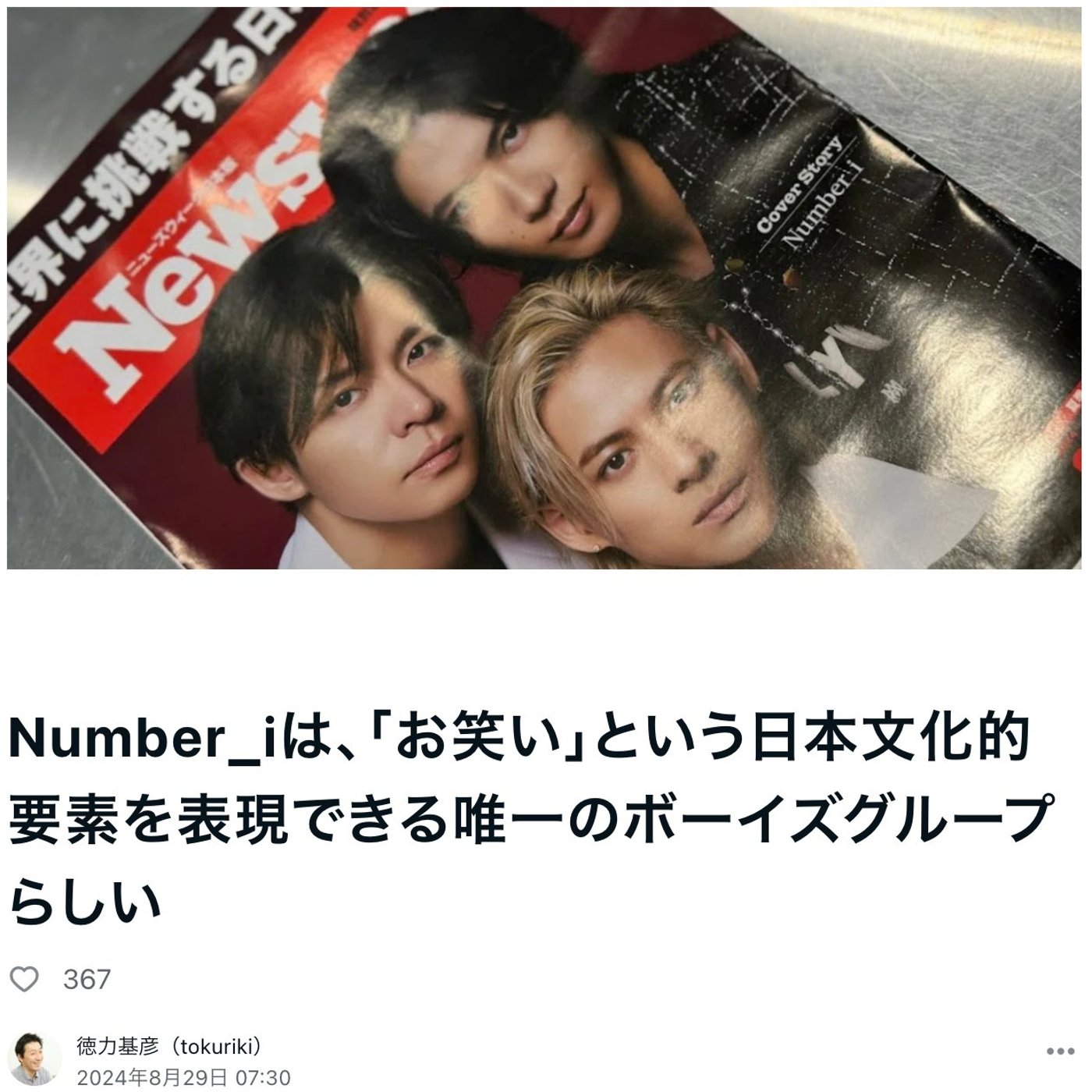 はい、こんにちは、徳力です。今日はですね、ちょっとNumber iに関してのニューズウィークの特集が非常に面白かったので、ご紹介したいと思います。