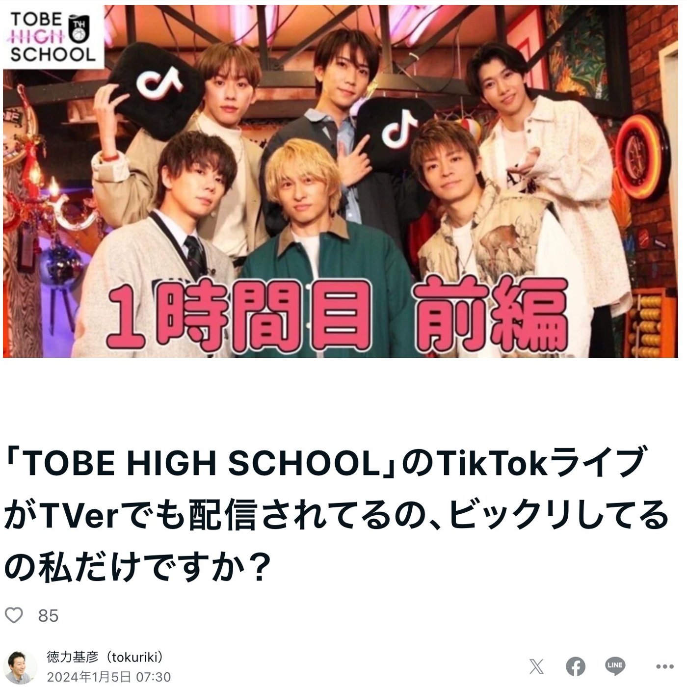 はい、こんにちは、徳力です。今日はですね、ちょっとTOBEネタが続いてるんですけど、TOBEがね、ちょっと