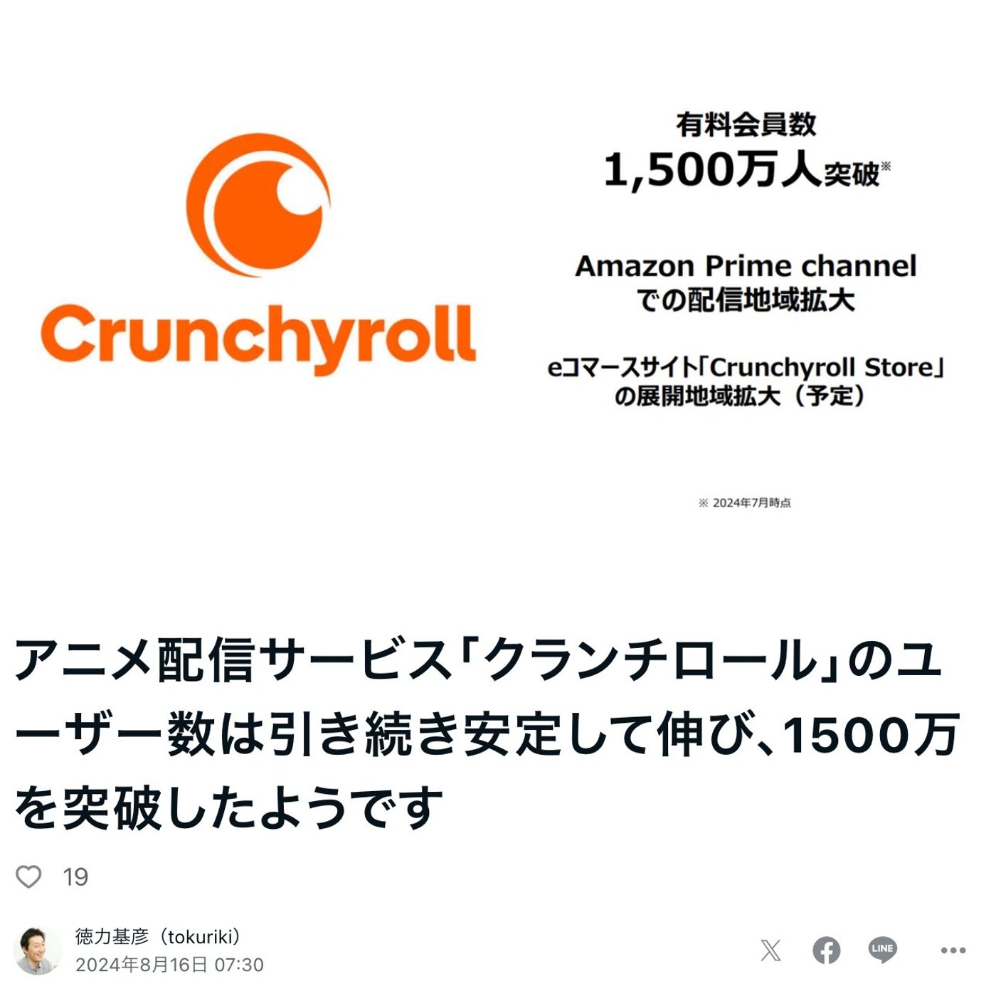 はい、こんにちは、徳力です。今日はですね、アニメ配信サービスのクランチロールが有料会員数1500万人突破したという記事がありましたので、ちょっとご紹介したいと思います。