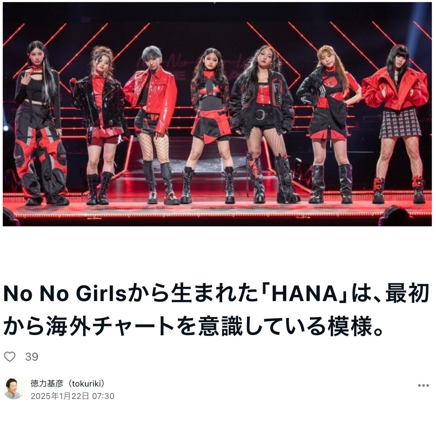 はい、こんにちは、徳力です。今日はですね、先週に引き続いてNo No Girlsのネタですけれども、着々とNo No Girlsのデビューの情報が出てきてまして、最初のプレレビュー曲のリリースが1月31日に決まったということで、