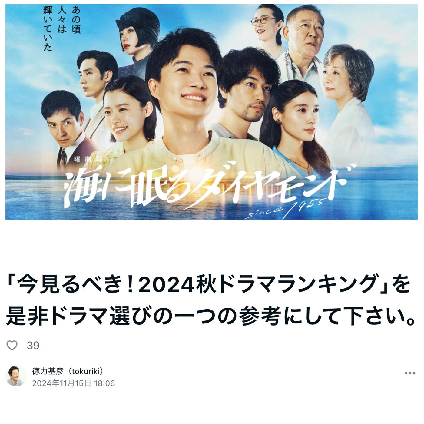 今見るべき2024秋ドラマランキングですね。ITメディアさんにも記事にしていただいたんですけれども、ドラマのランキングはいろいろあるので、当然いろんなランキングを皆さん参考にしてドラマ選びをされてるんだと思うんですけれども、