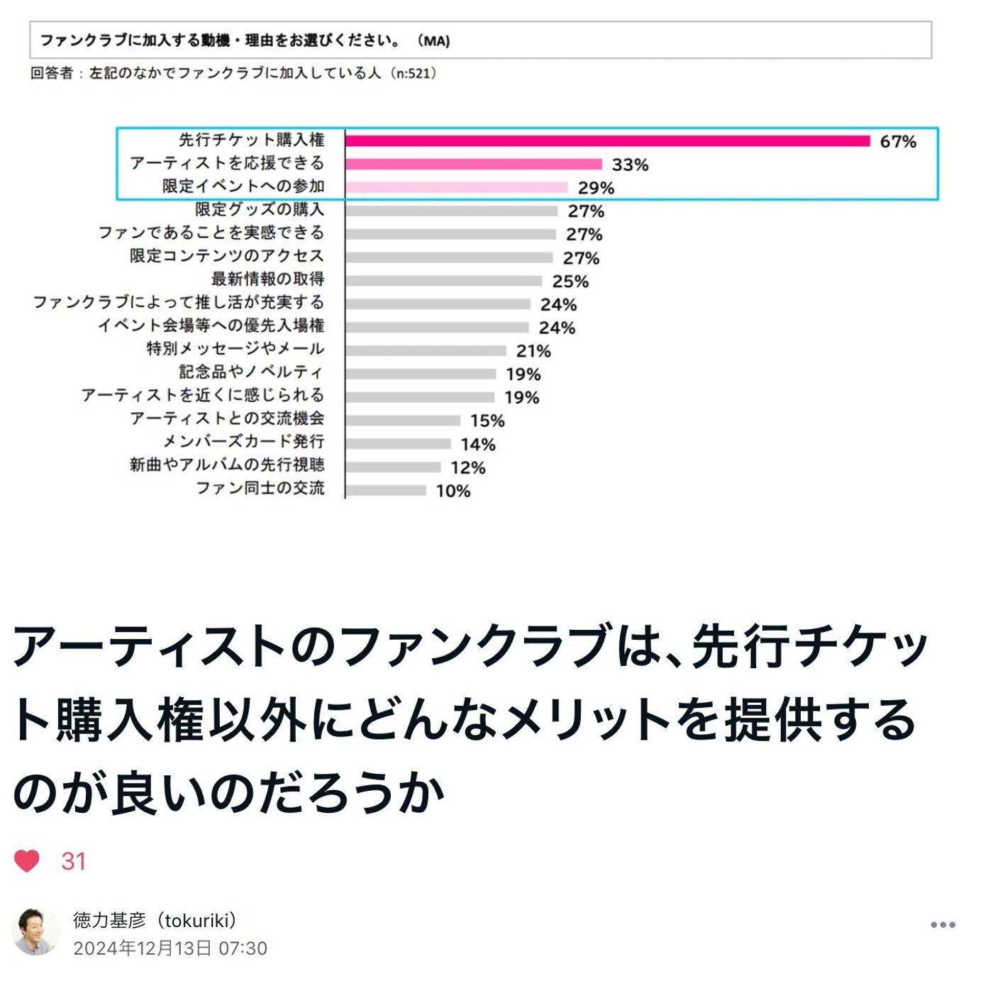 今回のリサーチにおいては、先行チケット購入権がファンクラブのメリットになっているのに、