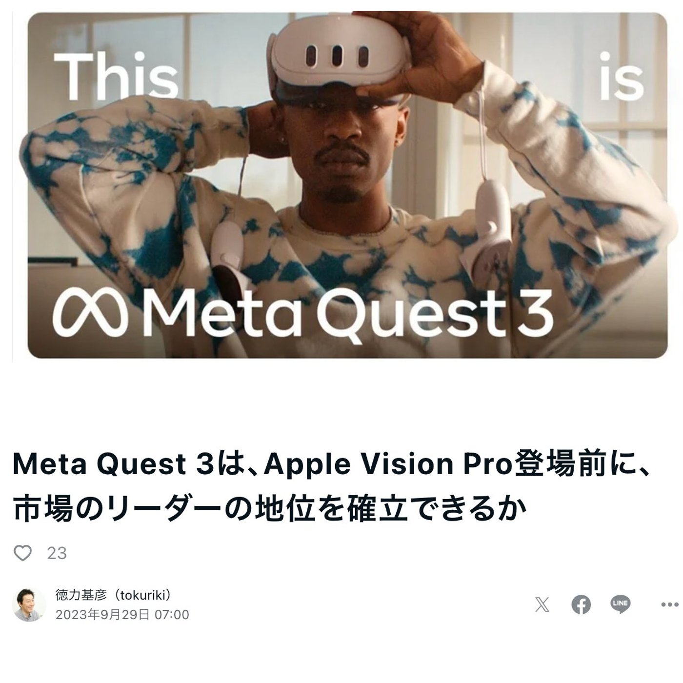はい、こんにちは、徳力です。今日はですね、Meta Quest 3がいよいよ 発売されたということで