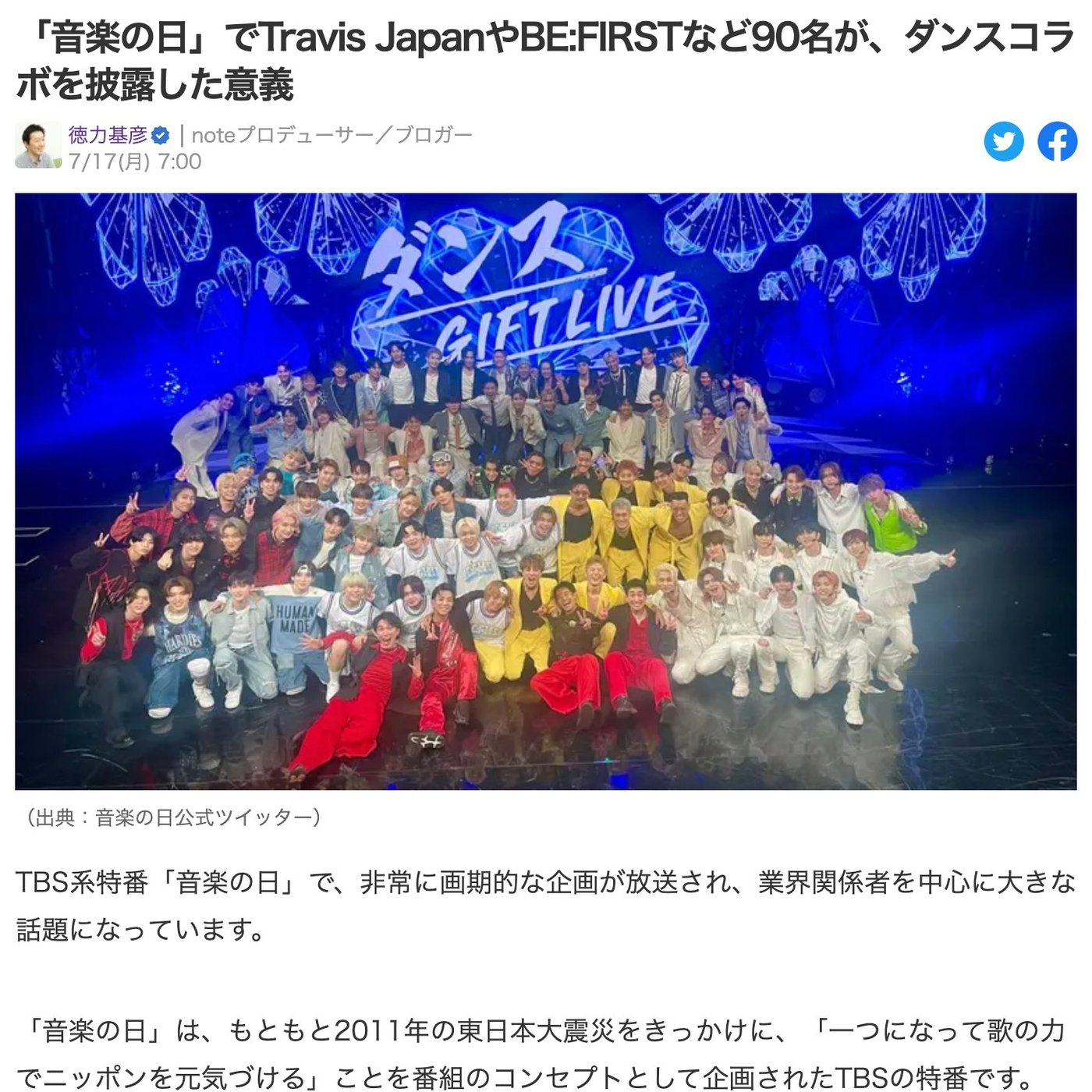 はい、こんにちは、徳力です。今日はですね、TBSさんが放送してた音楽の日が、なかなか歴史的な番組になったんじゃないかなと思うんで、ちょっと上に記事を書いたのでご紹介したいと思います。