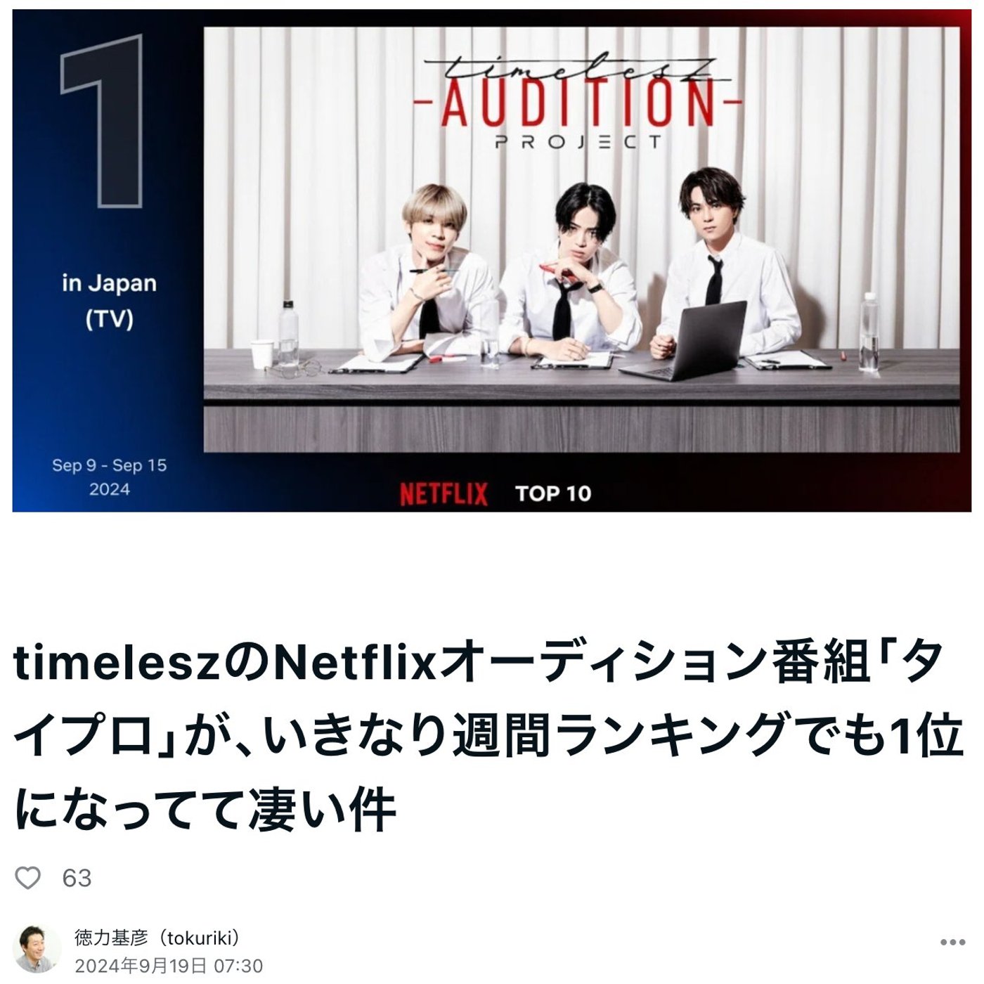 はい、こんにちは、徳力です。今日はですね、Netflixで始まりましたtimeleszのオーディションプロジェクト、略してタイプロって言えばいいかな、凄いんですよね。