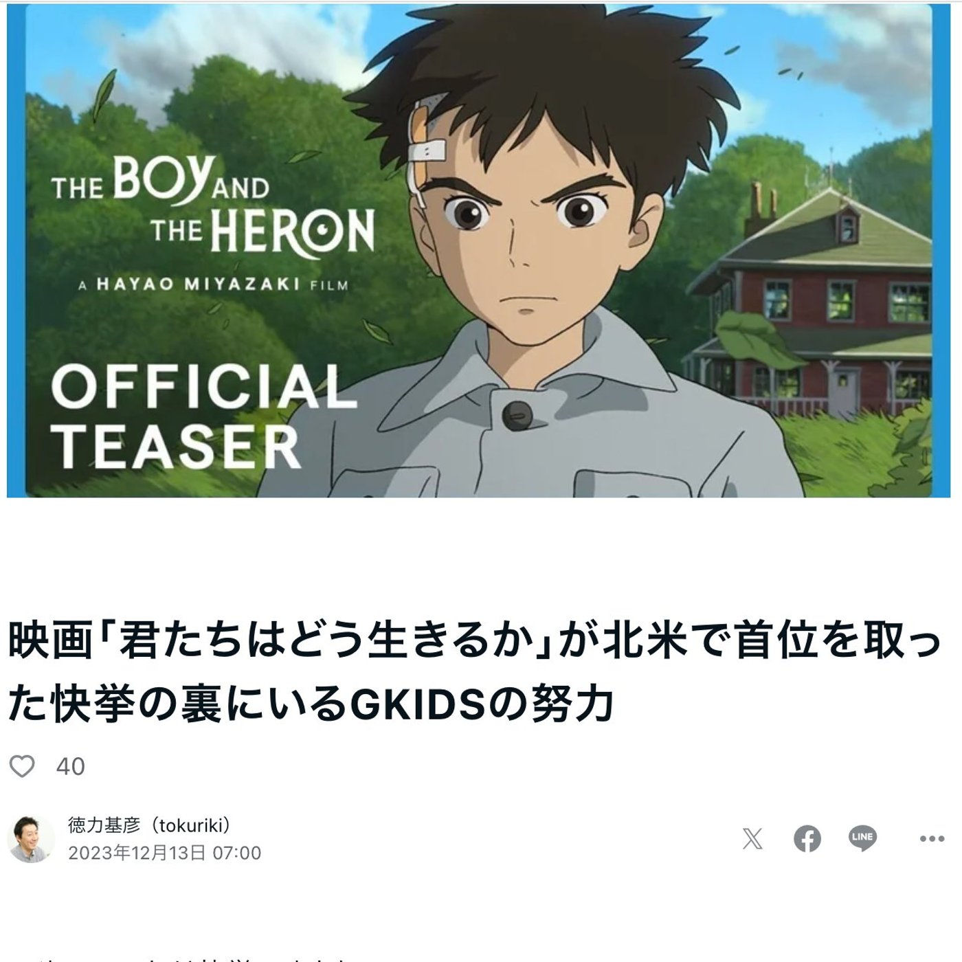 はい、こんにちは、徳力です。今日はですね、ジブリ映画が開挙ということで、映画、「君たちはどう生きるか?」が北米でなんと1位スタート。ここのジブリ映画の記録を全部塗り替えて、首位発進ということで、おめでとうございます。