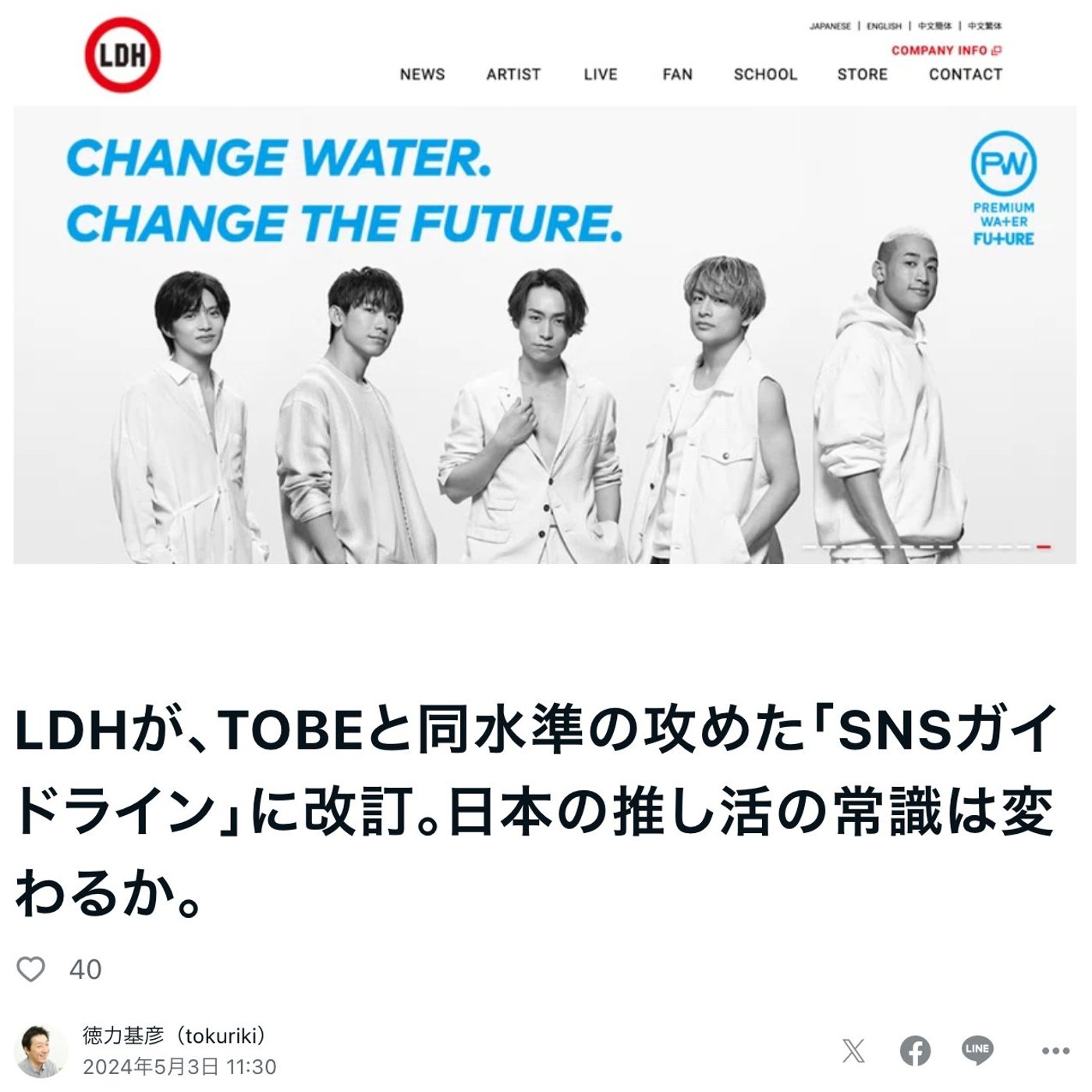 記事のタイトルは、LDHがTOBEと同水準の攻めたSNSガイドライン改訂と、日本の推し活動の常識が変わるかというタイトルにしてみたんですけど、