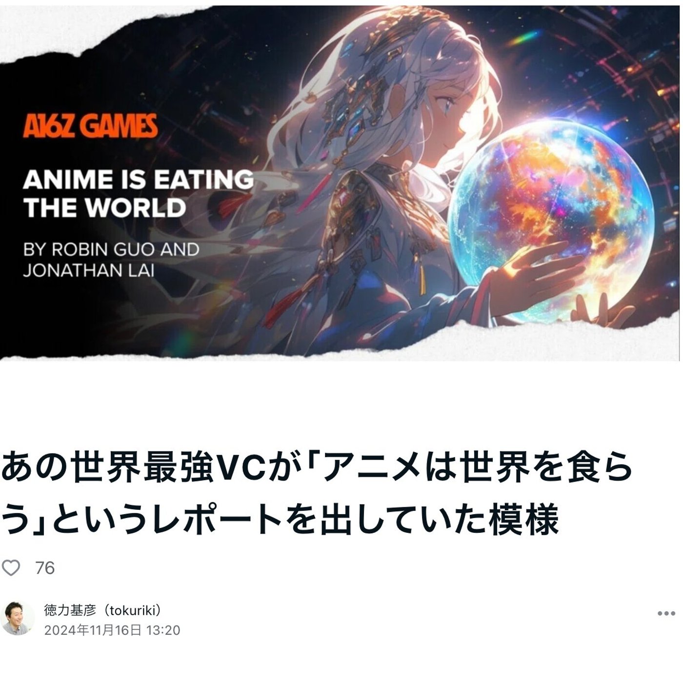 はい、こんにちは、とくりけです。今日はですね、アンドリー・セン・ホロウィッツがアニメ is eating the world っていうレポートを出しているっていうのを教えてもらったので、ちょっと面白かったのでご紹介したいと思います。