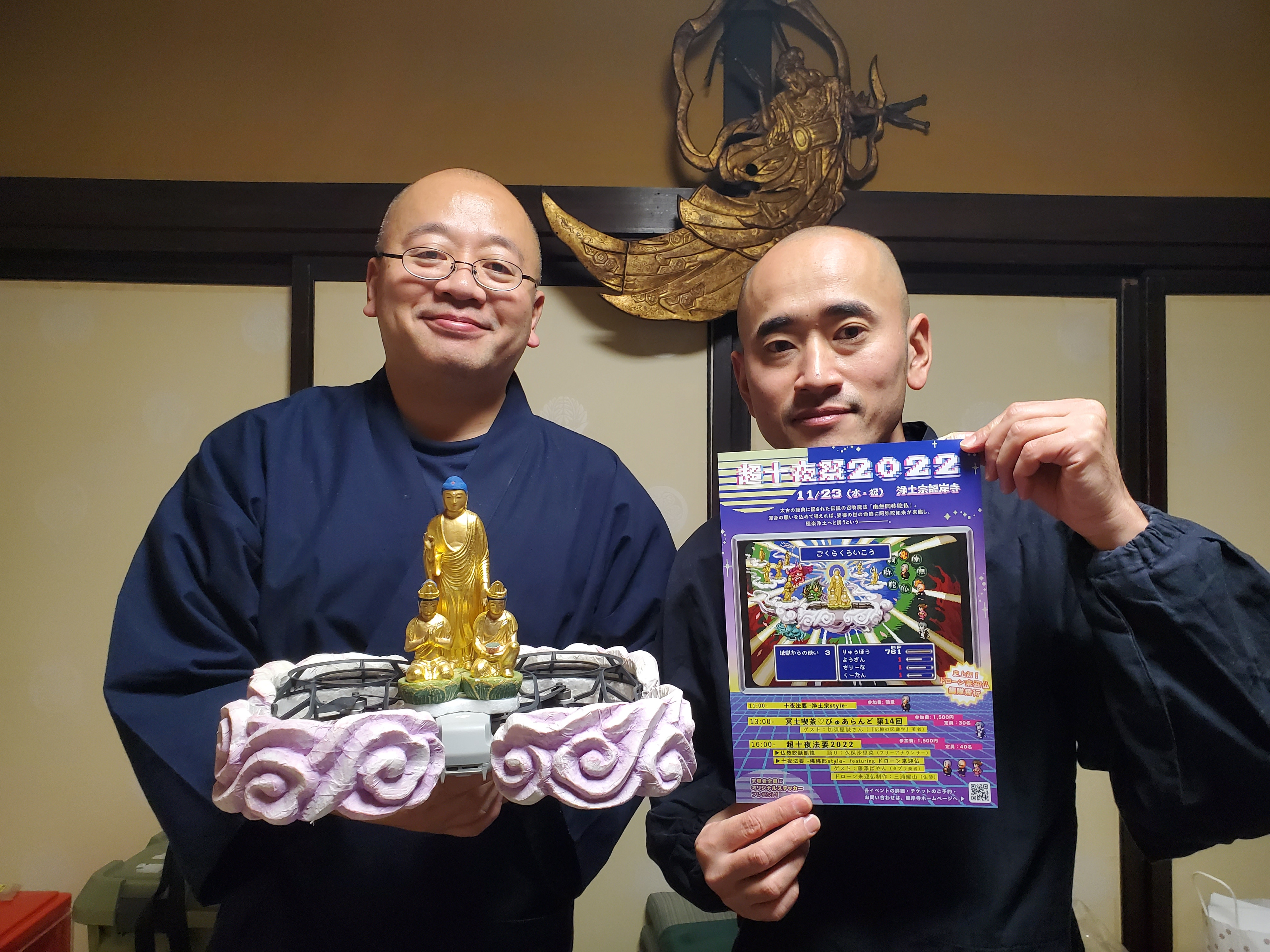お坊さんに聞け62 池口龍法さんが住職をする京都・龍岸寺で11月23日に開催の「超十夜祭2022」では、仏像をのせたドローン10機が編隊飛行を繰り広げます。仏師の三浦耀山さんがめざしたのは、浄土から諸仏がお迎えに来る来迎(らいごう)の様子を再現すること。それは古来から人々が追い求めた表現でもあります。