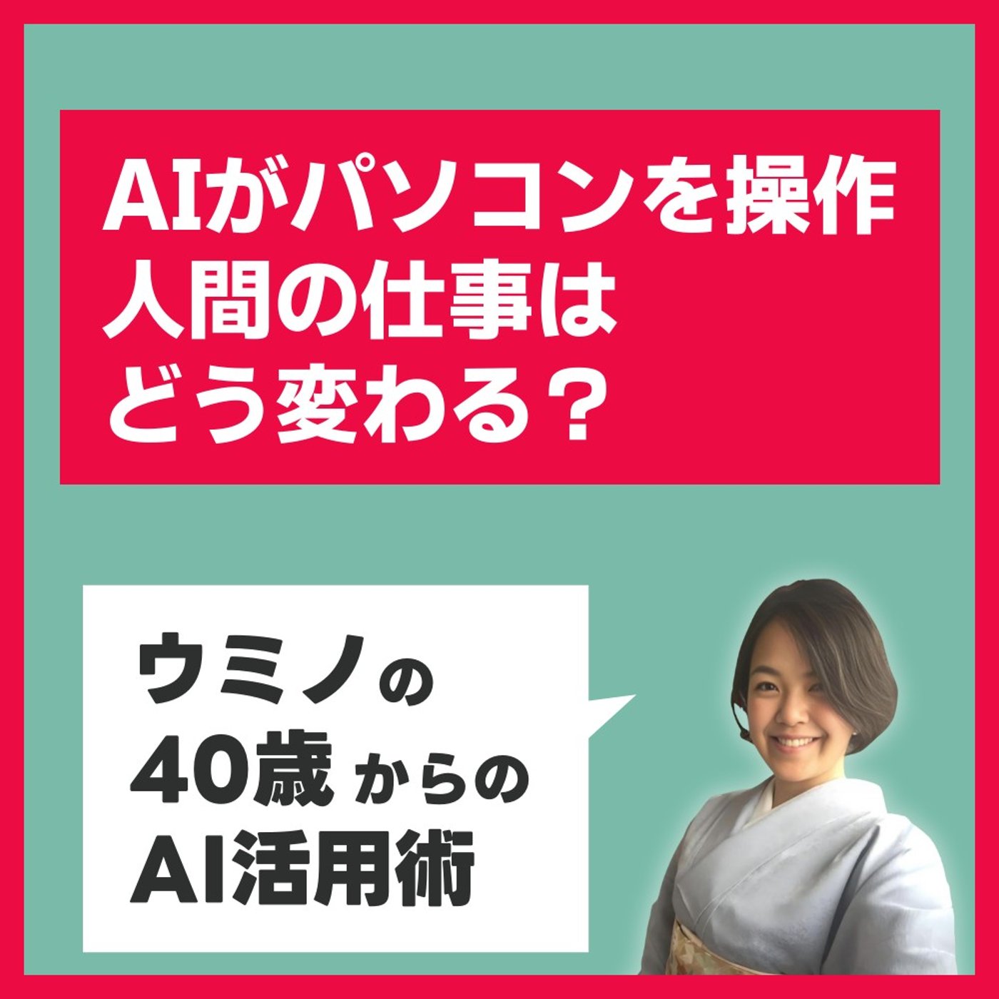 アメリカからこんにちは。40歳からのAI活用塾のウミノです。40歳からのAIは楽しいだけじゃダメ。AIを使って仕事や育児、生活を1日2時間時短する方法をさくっとお伝えしていきます。