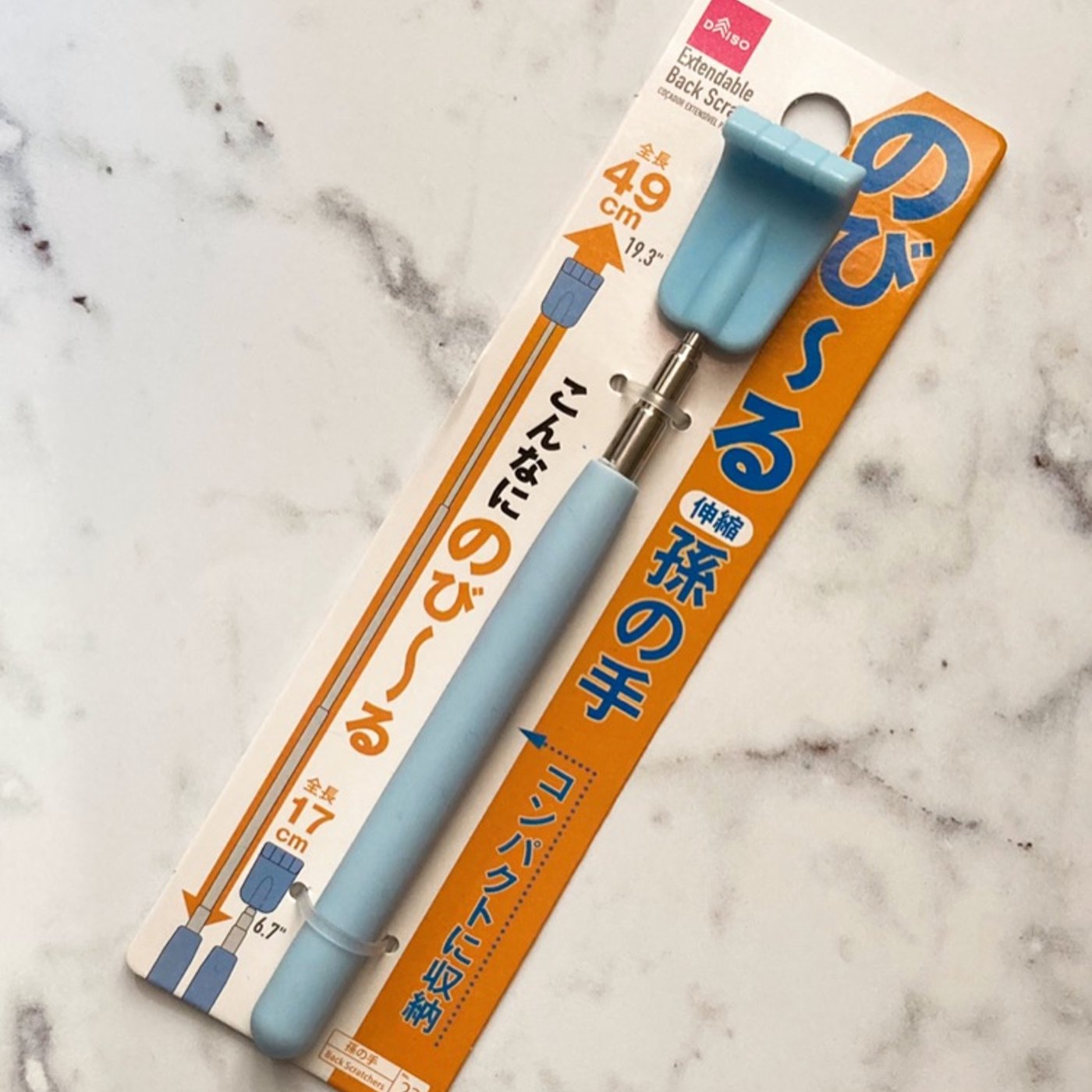 なんとダイソーに100円ショップで売ってました。伸びる孫の手っていう台がついてたんですけど、本当に簡単にね、こうシュッて伸びて、