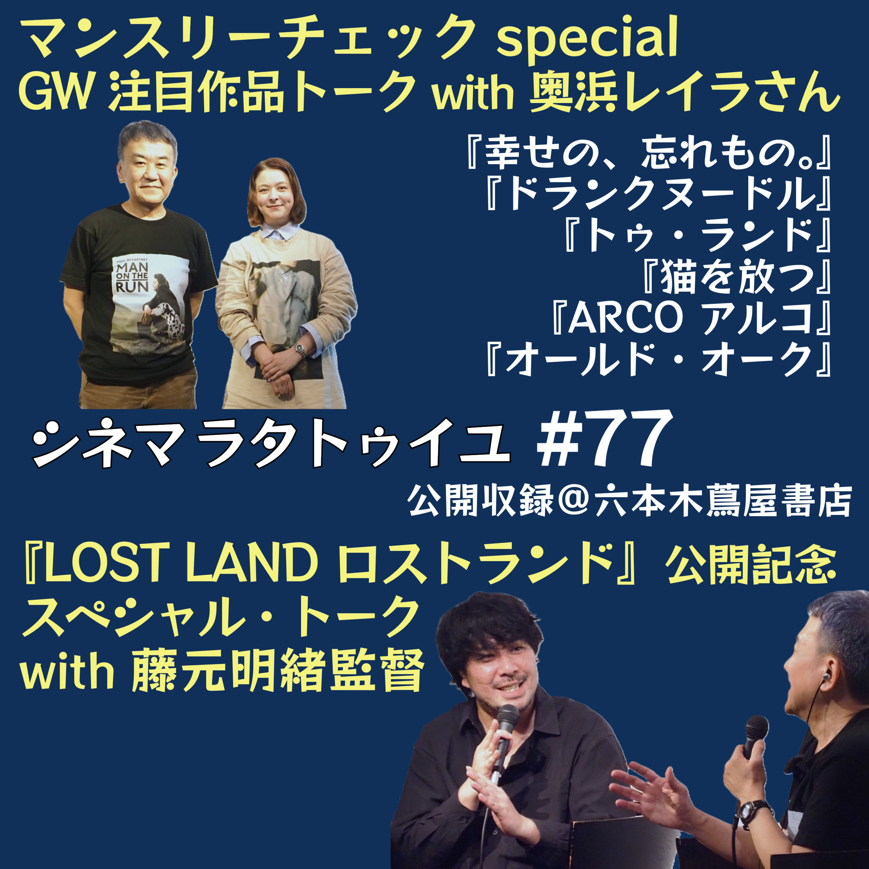 公開収録回!GW映画の注目作として『幸せの、忘れもの』『ドランクヌードル』『トゥ・ランド』『猫を放つ』『ARCO アルコ』『オールド・オーク』を奥浜レイラさんと語り合い、藤元明緒監督が新作『LOSTLAND ロストランド』の製作過程や撮影秘話をたっぷりと語って下さっています。