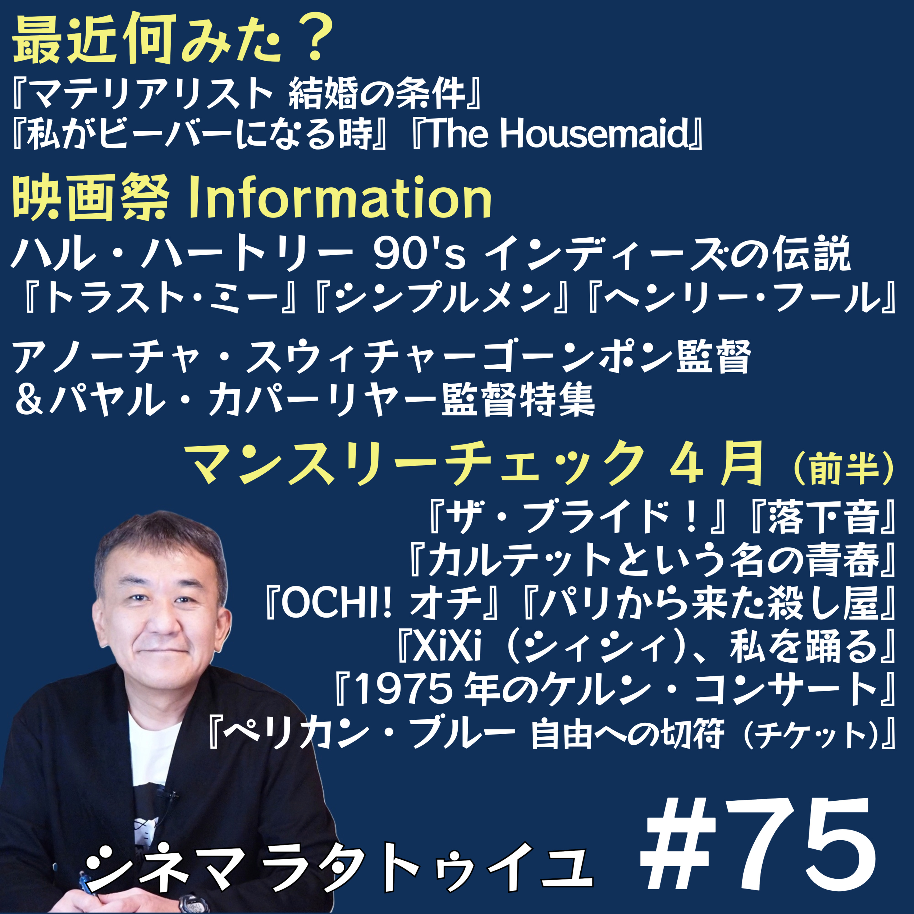 ハル・ハートリー監督特集から『トラスト・ミー』『シンプルメン』『ヘンリー・フール』を紹介し、4月前半公開作品チェックとして『1975年のケルン・コンサート』『パリから来た殺し屋』『XiXi(シィシィ)、私を踊る』『ペリカン・ブルー 自由への切符(チケット)』『落下音』等を大推薦し、最近見た映画として『マテリアリスト結婚の条件』『私がビーバーになる時』などを語っています。メールは是非こちらから:https://forms.gle/AixjXzRRYNSYPW5N8