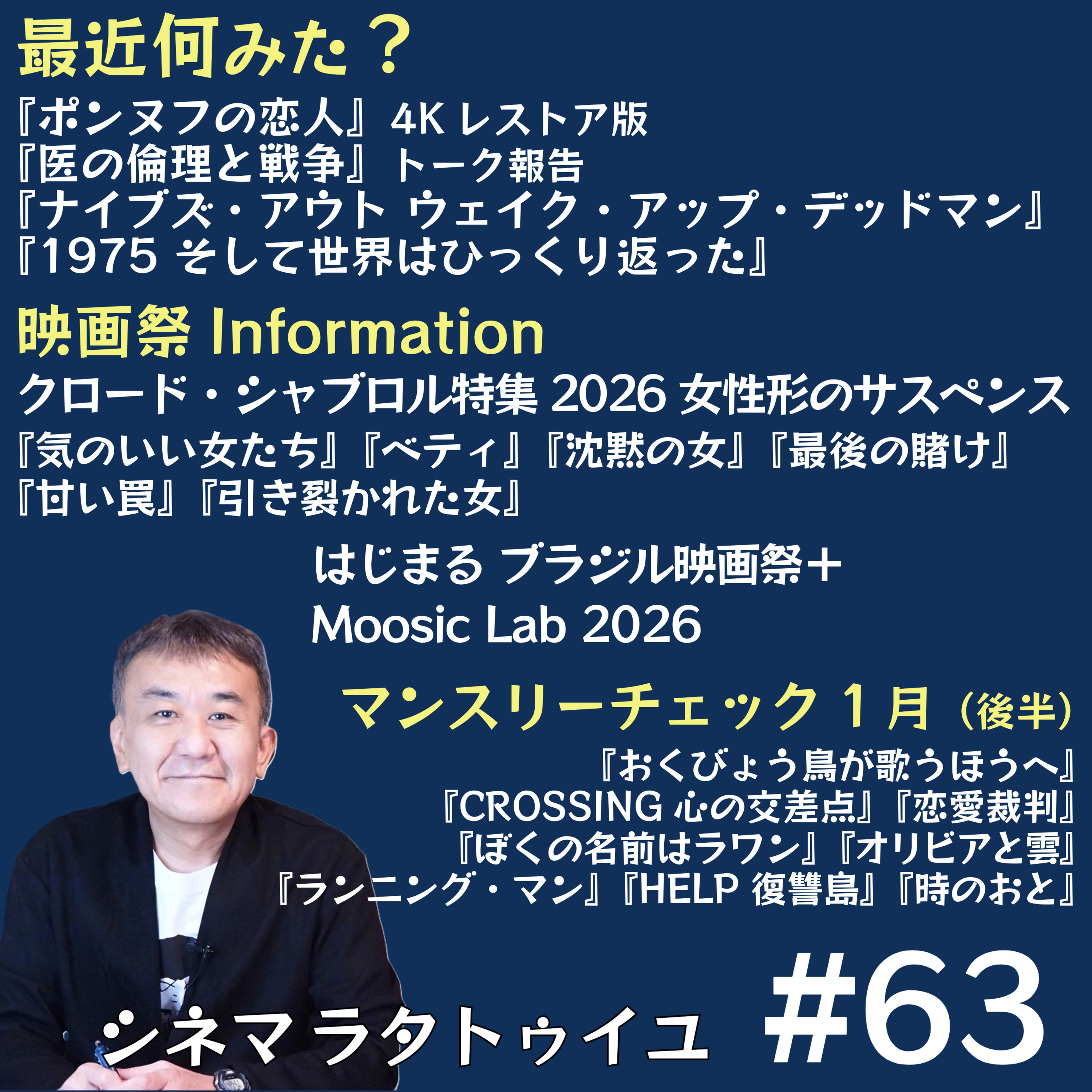 クロード・シャブロル監督特集紹介(前半)として、監督について語りながら『気のいい女たち』を始めとする6本を紹介。そしてブラジル映画祭をメンションした上で、1月公開作品チェック(後半)として『おくびょう鳥が歌うほうへ』『CROSSING 心の交差点』『時のおと』『僕の名前はラワン』『恋愛裁判』などを語っています。メールは是非こちらから!