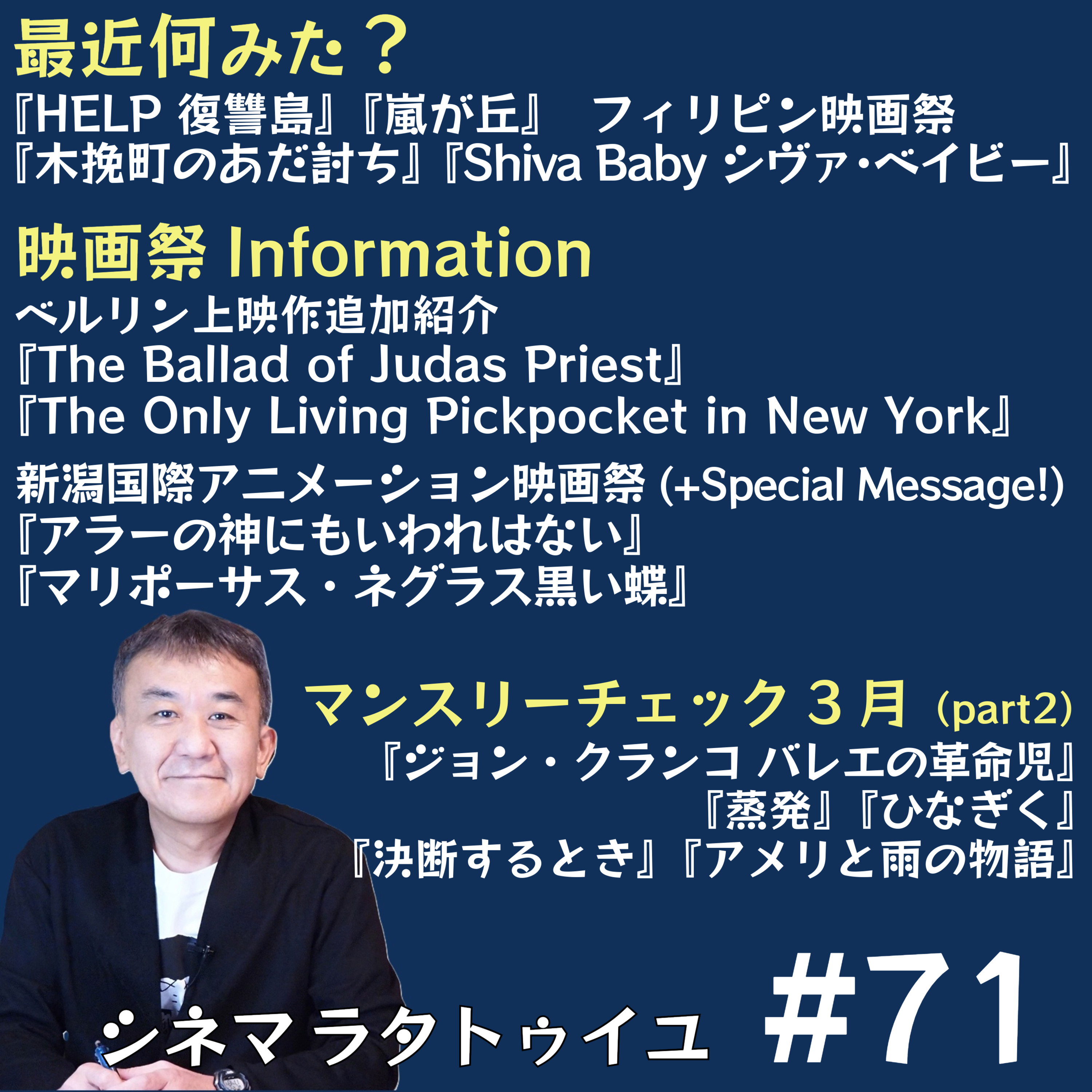 最近見た映画から『HELP 復讐島』『木挽町の仇討ち』『シヴァ・ベイビー』、ベルリン映画祭で観た『The Ballad of Judas Priest』『The Only Living Pickpocket in New York』を紹介し、新潟国際アニメーション映画祭報告と素晴らしいゲストコメントをお届けし、3月公開作から『ジョン・クランコ バレエの革命児』『蒸発』『ひなぎく』『決断するとき』『アメリと雨の物語』等を推薦し、ロッテルダムとベルリンのおみやげ抽選で盛り上がっています。