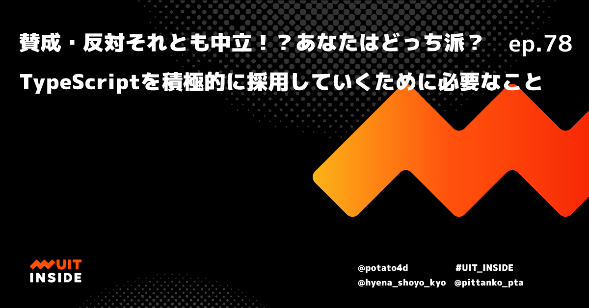 ep.77 の延長戦として、@potato4d が、 @hyena_shoyo_kyo と @pittanko_pta に、 TypeScript を推進していくための考え方について話しました。