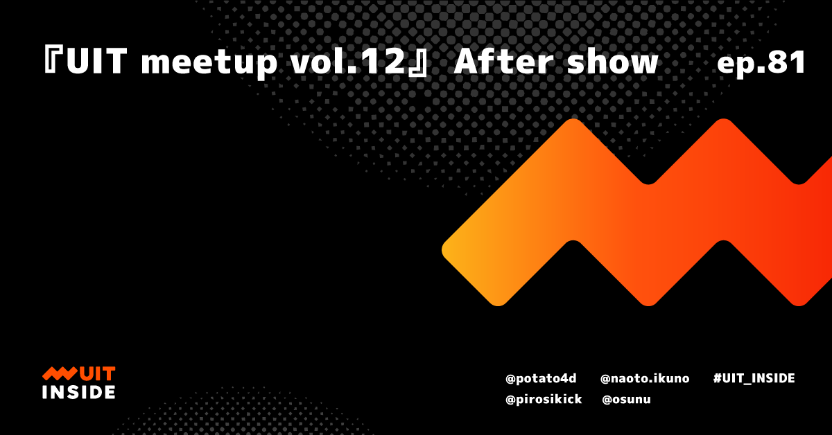 ゲストにサイボウズ株式会社より @pirosikick、株式会社カカクコムより @osunu を招待し、イベント運営の @potato4d、社内登壇者の @naoto.ikuno を含めた 4 人で、 UIT meetup vol.12 のアフタートークの延長戦を行いました。