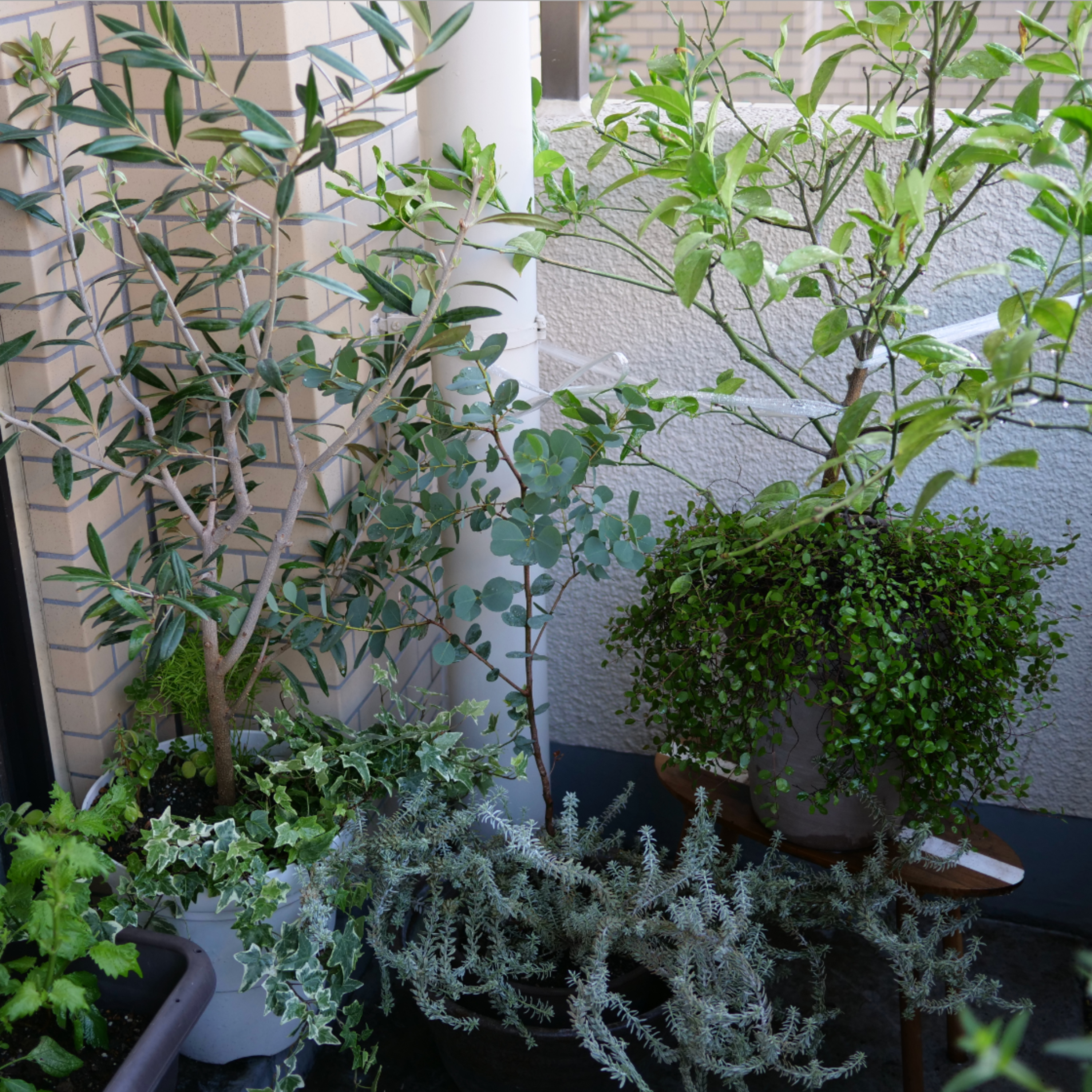 左からオリーブの株元にはアイビーとかアスパラガスとか植えてて、