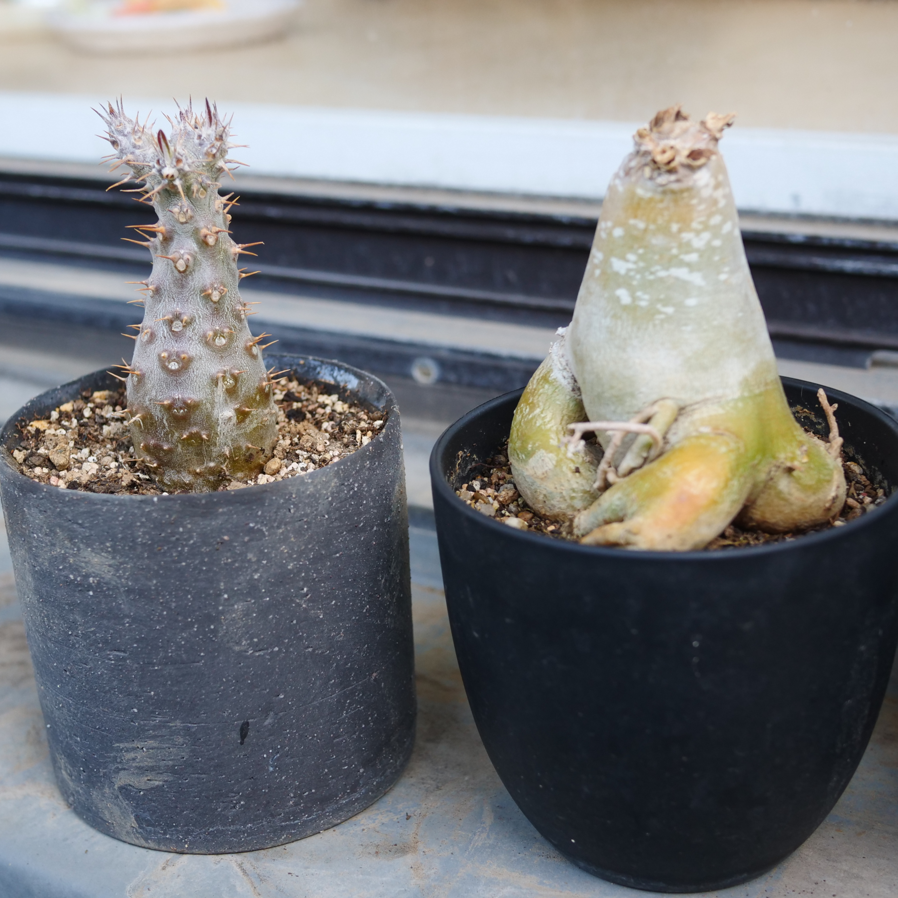 なるほど。お持ちしました。こちらなんですけど、 左側パキポディウム、右側アデニウム。