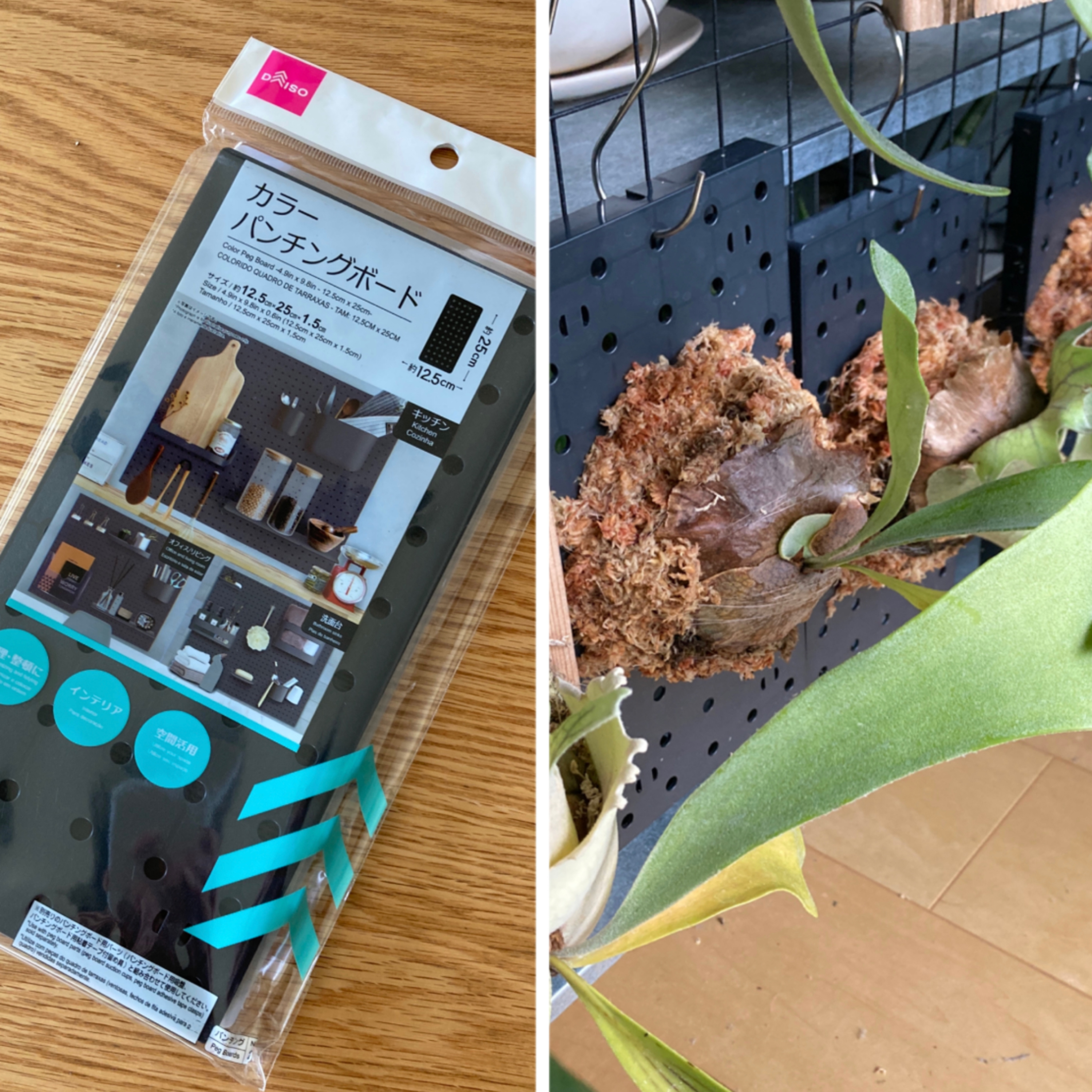 最近またビカクシダいじりたい熱が再燃してまして、子株たちの板付けをしてました。最初は普通の木の板にする予定だったのですが、ダイソーでいい感じのパンチングボードを見つけ、試してみることにしました。