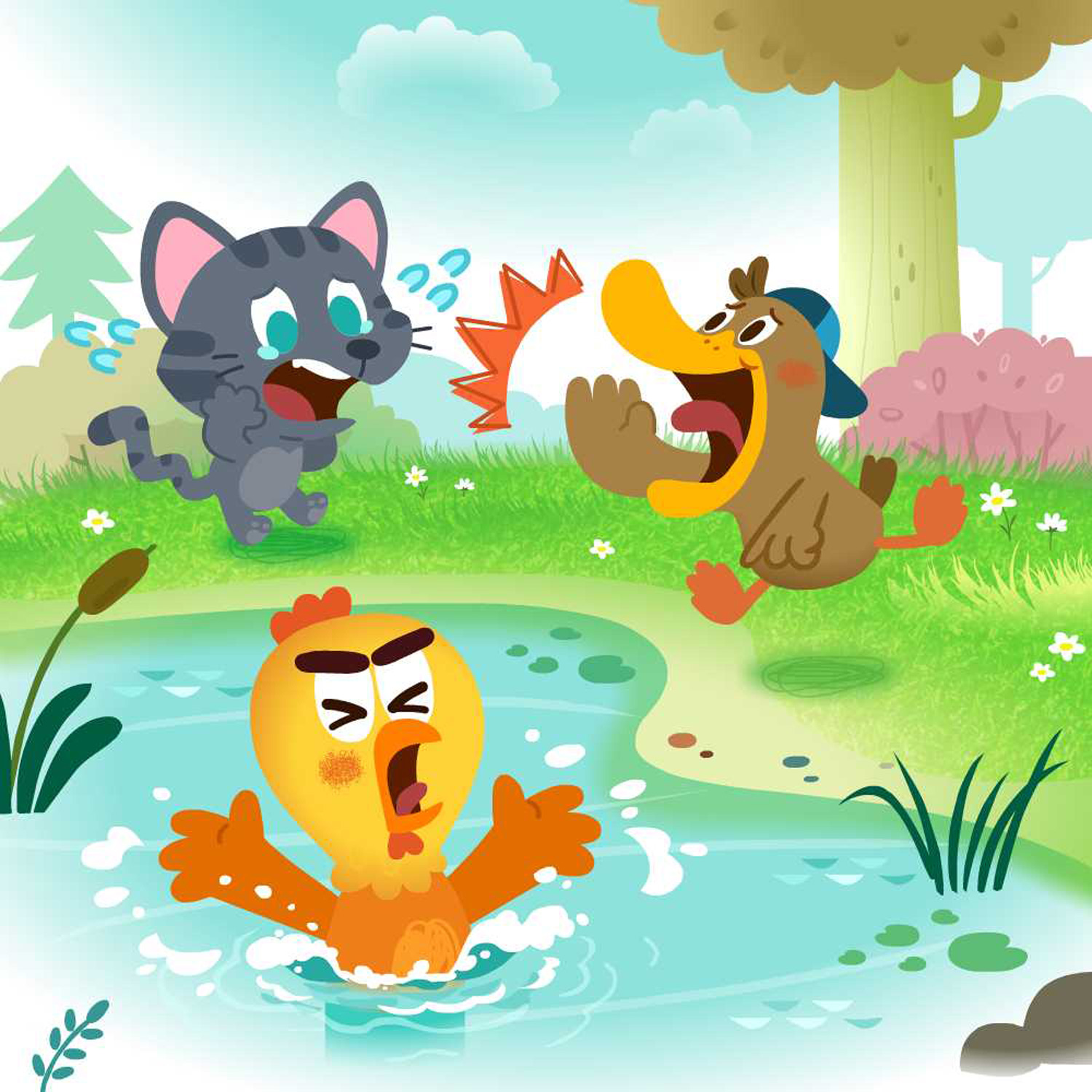 ニワトリくん、ネコちゃん、アヒルくんは仲良しのお友達。いつも一緒に遊んでいます。
